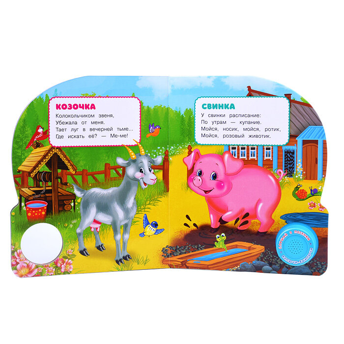 Ребёнок с удовольствием будет листать плотные страницы, рассматривать красочные картинки, вместе с родителями читать и слушать добрые стихи про животных. Малыш легко освоит включение звука: по нажатию на кнопку песенка включится, при втором нажатии выключится, при третьем – заиграет следующая композиция и т.д. Благодаря компактному размеру книгу удобно взять с собой в дорогу.