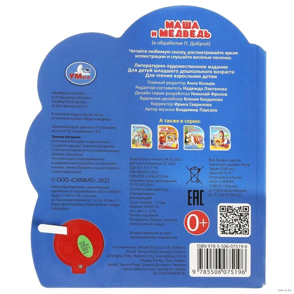 Ребенок с удовольствием будет листать плотные страницы, рассматривать яркие картинки, вместе с родителями читать известную сказку и, конечно, нажимать на кнопку и слушать веселые песенки. Малыш легко освоит включение звука: по нажатию на кнопку песенка включится, при втором нажатии выключится, при третьем – заиграет следующая композиция. Благодаря компактному размеру книгу удобно взять с собой в дорогу.