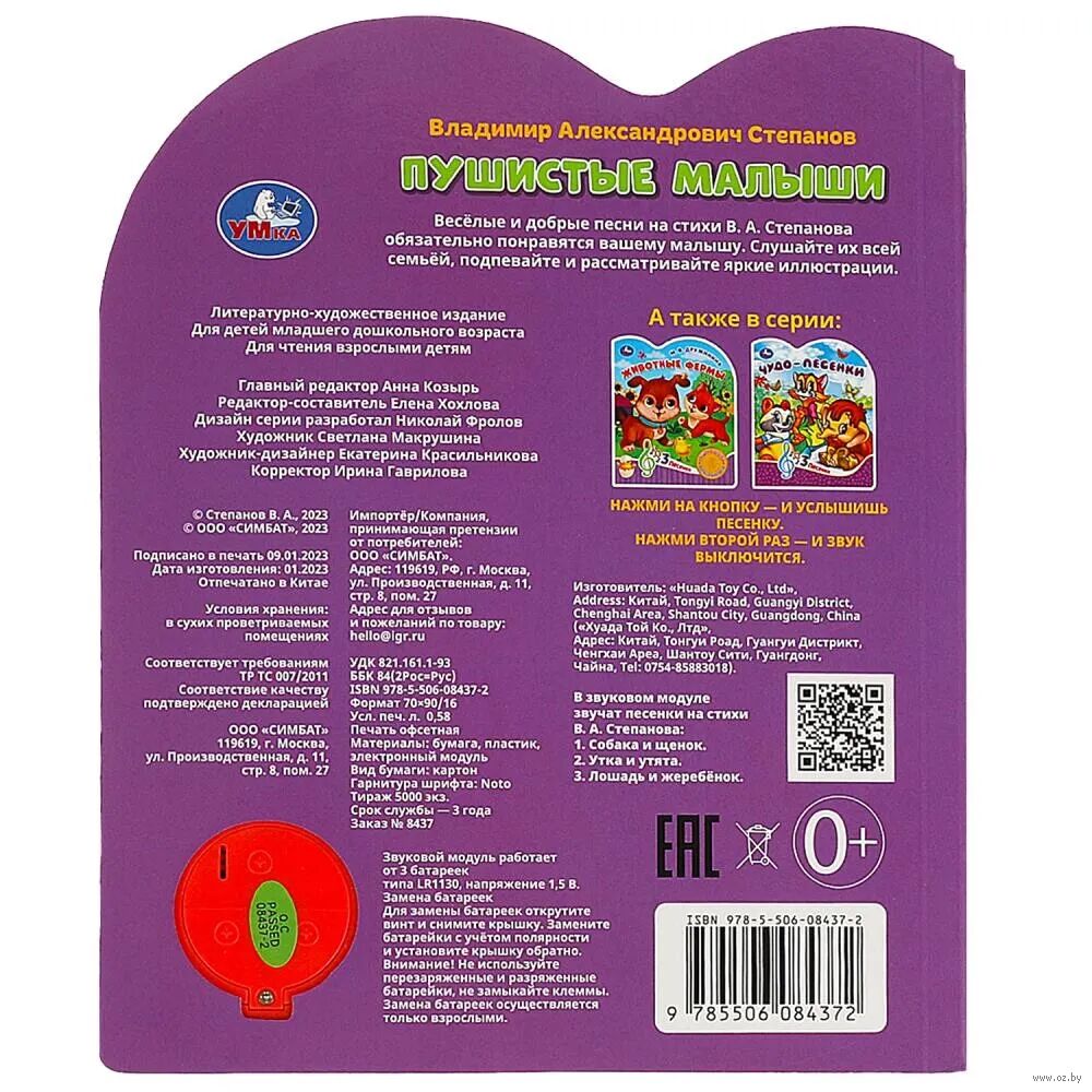 Ребенок с удовольствием будет листать плотные страницы, рассматривать красочные картинки, вместе с родителями читать и слушать добрые стихи про животных. Малыш легко освоит включение звука: по нажатию на кнопку песенка включится, при втором нажатии выключится, при третьем – заиграет следующая композиция и т.д. Благодаря компактному размеру книгу удобно взять с собой в дорогу.