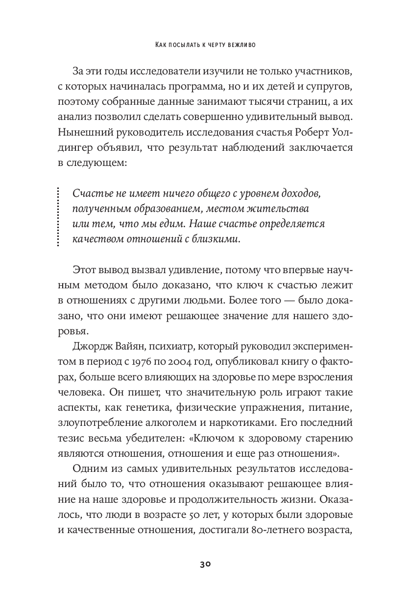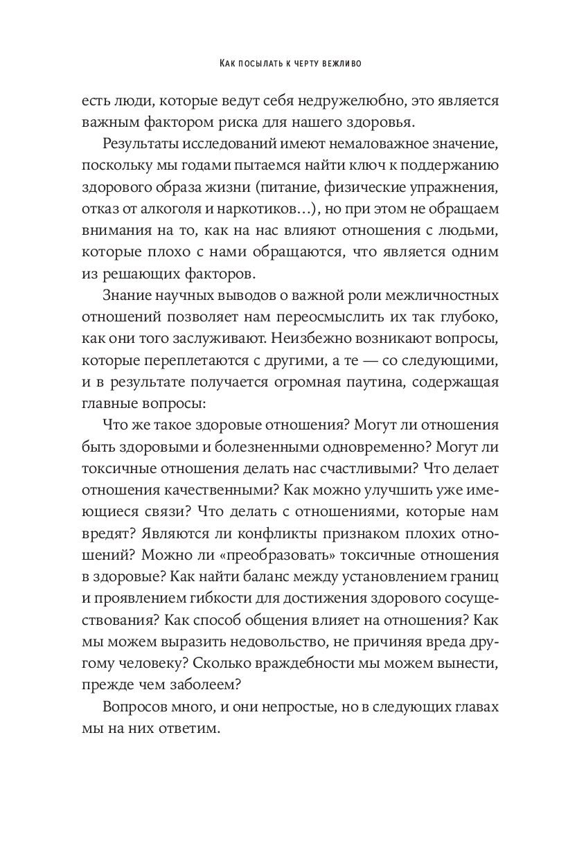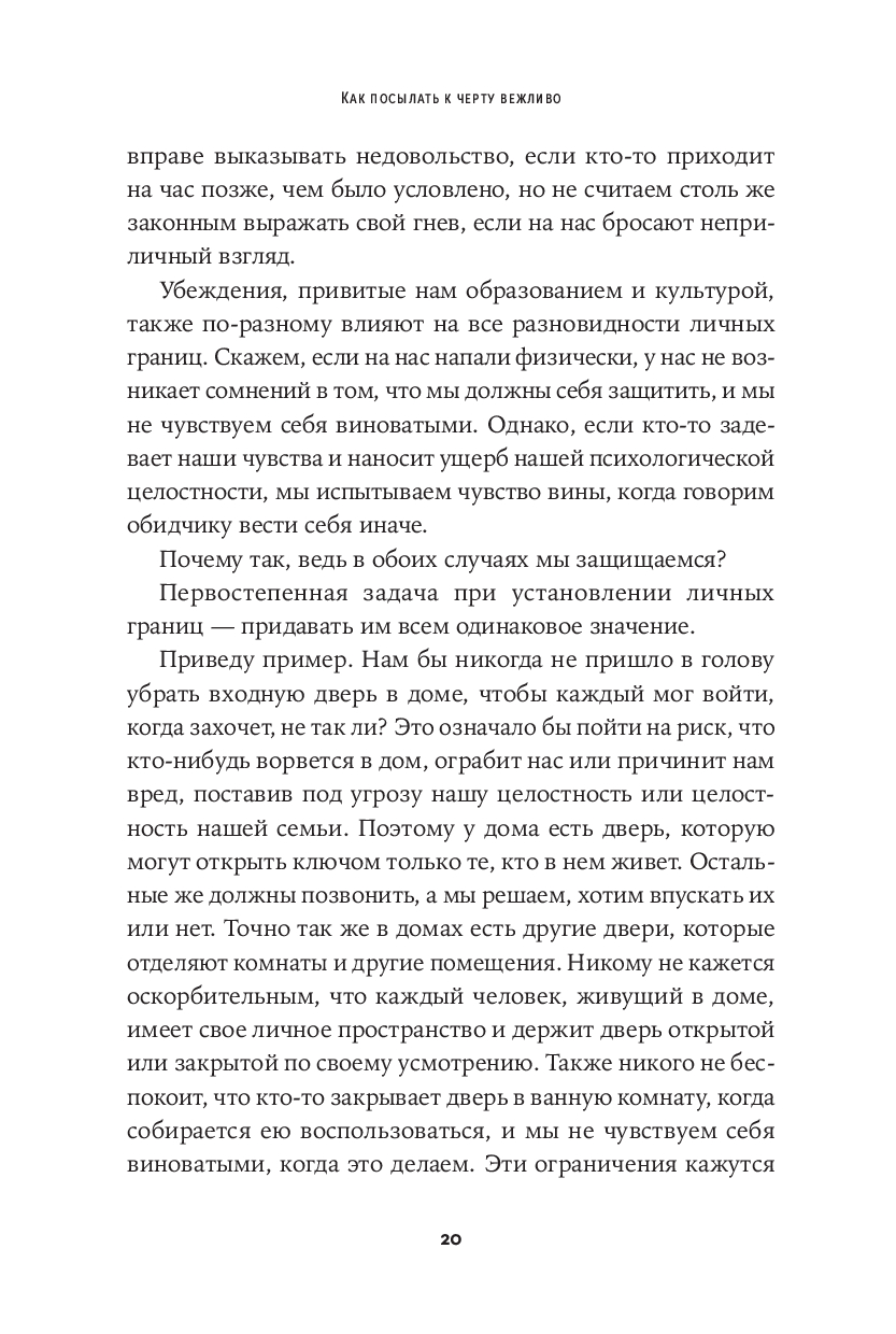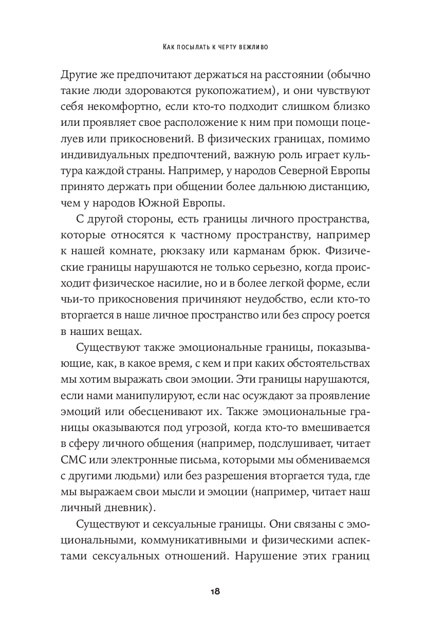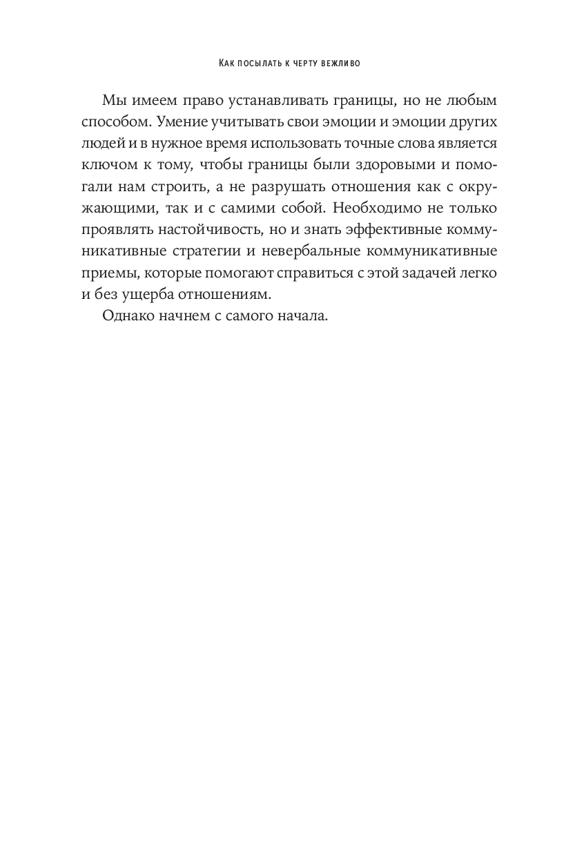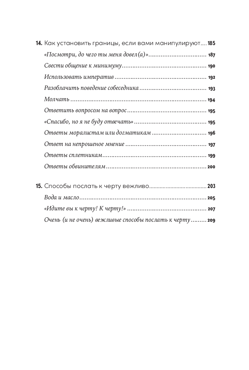 "Как вежливо посылать к черту" – практическое руководство для тех, кто устал от манипуляций и хочет научиться говорить "нет" уверенно и без чувства вины. Опытный психолог с более чем десятилетней практикой Альба Кардальда рассказывает, как выстраивать личные границы и реагировать на критику, сохраняя уверенность и эмпатию. Освоив такие методы, как активное слушание или "я-сообщения", вы научитесь лучше понимать свои эмоции, обретете свободу быть собой и укрепите отношения с близкими.