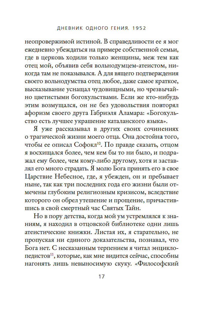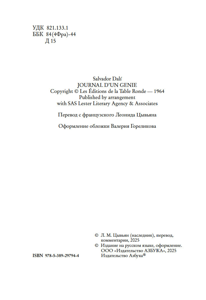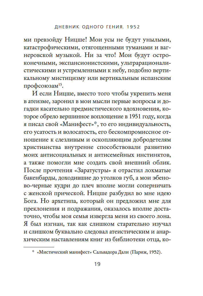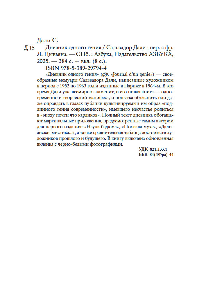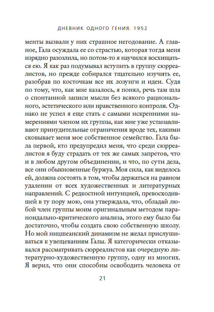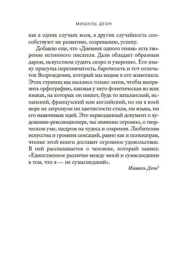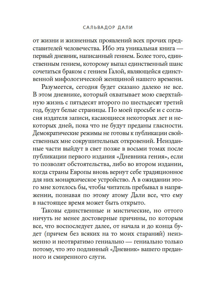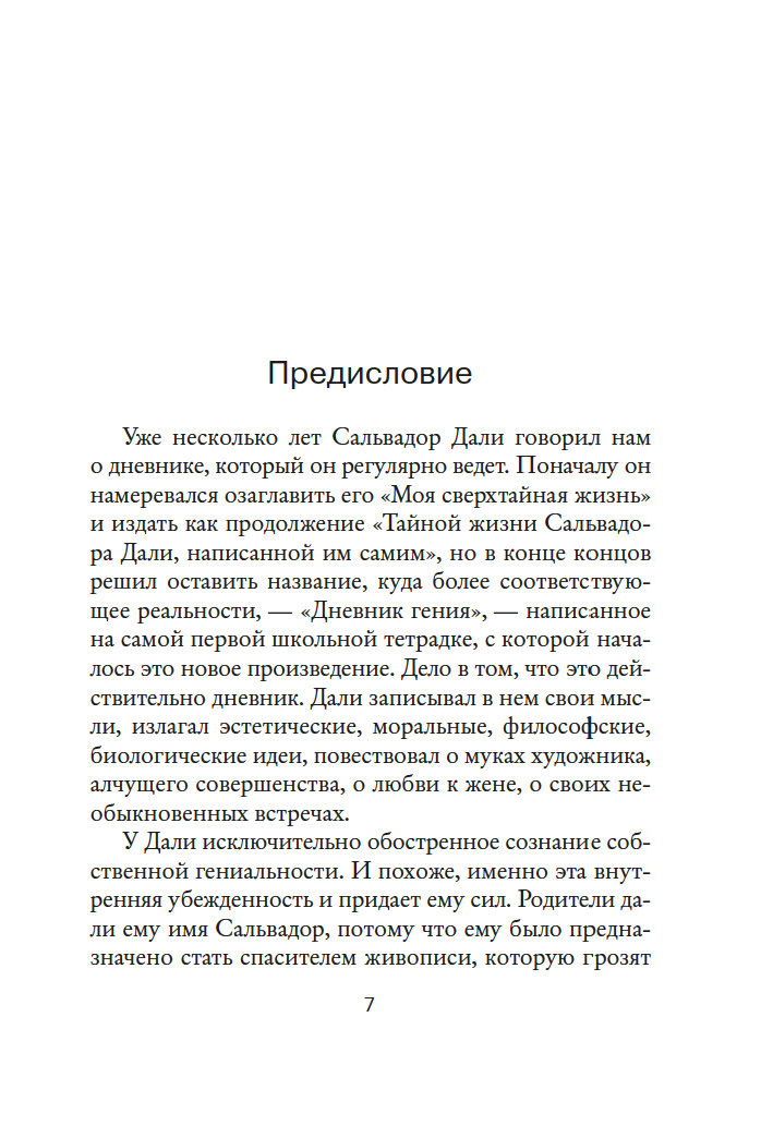 "Дневник одного гения" (фр. "Journal d’un genie") – своеобразные мемуары Сальвадора Дали, написанные художником в период с 1952 по 1963 год и изданные в Париже в 1964-м. В это время Дали уже всемирно знаменит, и его новая книга – одновременно и творческий манифест, и попытка объяснить или даже оправдать в глазах публики культивируемый им образ "подлинного гения современности", имевшего несчастье родиться в "эпоху почти что карликов". Полный текст дневника обогащают маргинальные приложения, предусмотренные самим автором для первого издания: "Наука бздюма", "Похвала мухе", "Далианская мистика...", а также сравнительная таблица достоинств художников прошлого и будущего. В книгу включена обновленная вклейка с черно-белыми фотографиями.