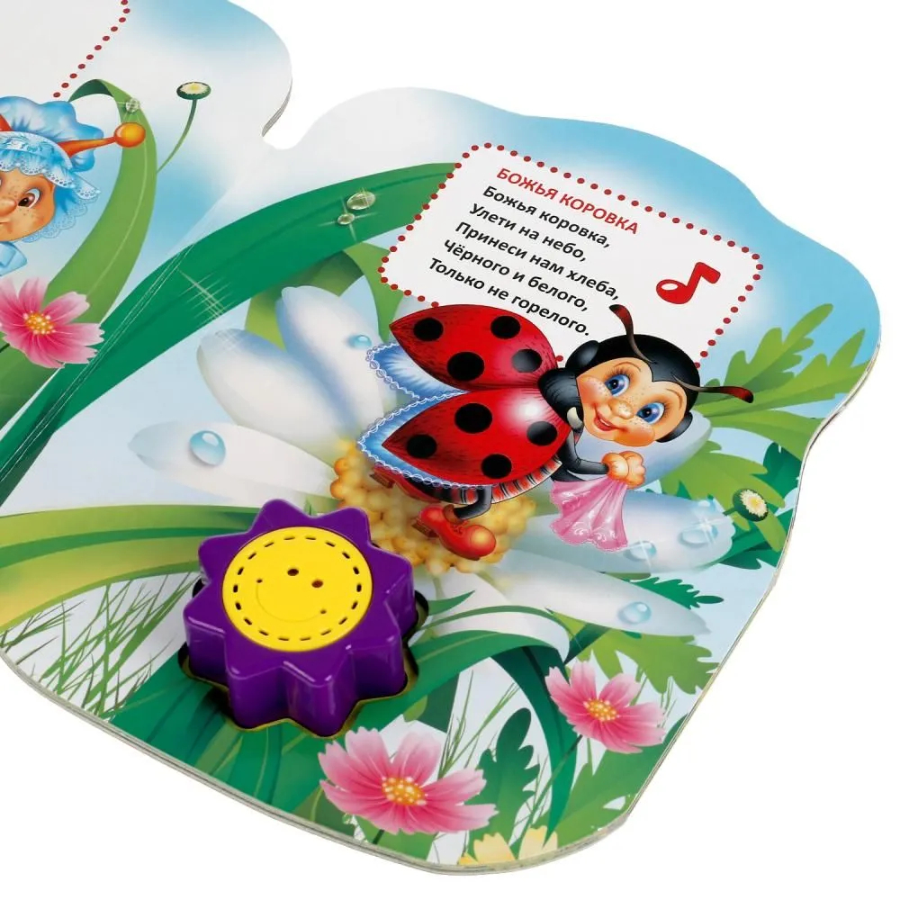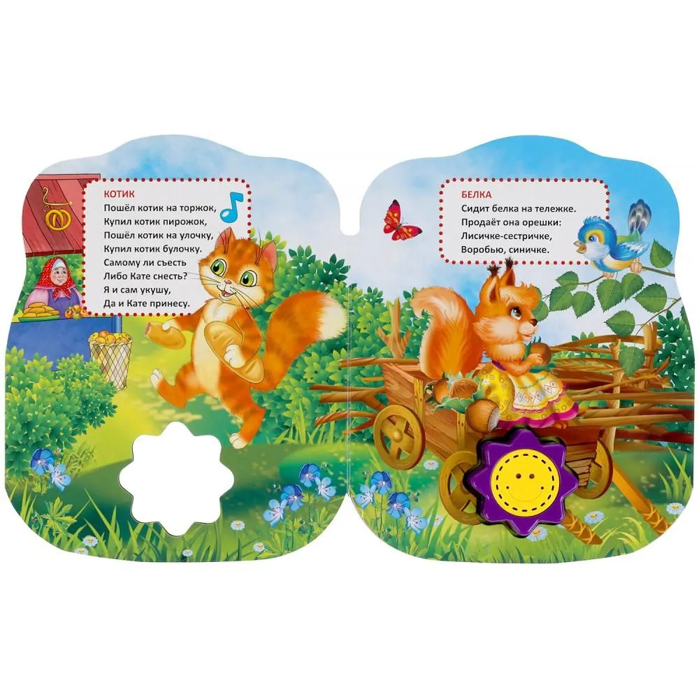 Ребёнок с удовольствием будет листать плотные страницы с фигурной вырубкой, рассматривать яркие картинки и слушать весёлые потешки. Малыш сможет легко освоить включение звука: при нажатии на кнопку включится первая песенка, при втором нажатии выключится, в 3-ий раз – заиграет следующая и т.д. Благодаря компактному формату книгу удобно взять с собой в дорогу.