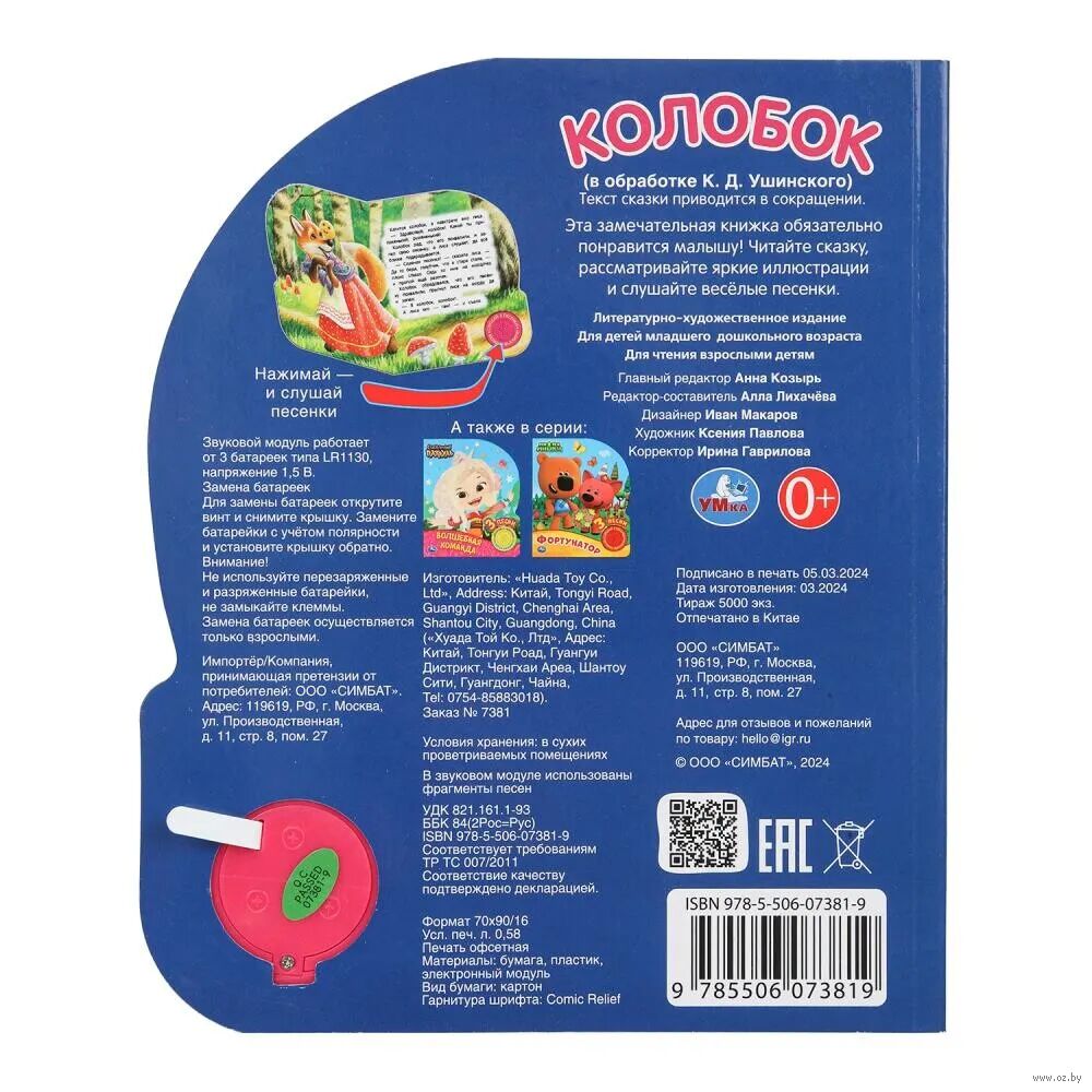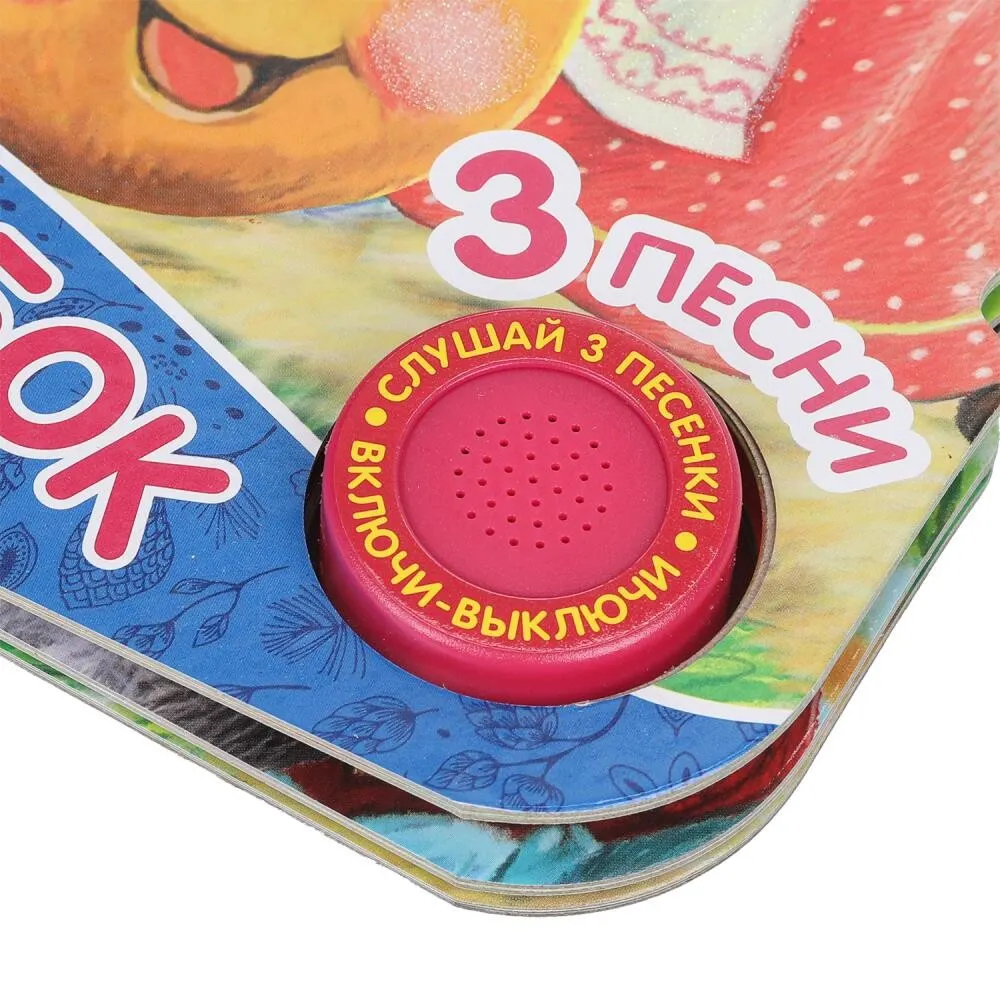 Ребенок с удовольствием будет листать плотные страницы, рассматривать яркие картинки, вместе с родителями читать известную сказку и, конечно, нажимать на кнопку и слушать веселые песенки. Малыш легко освоит включение звука: по нажатию на кнопку песенка включится, при втором нажатии выключится, при третьем – заиграет следующая композиция. Благодаря компактному размеру книгу удобно взять с собой в дорогу.