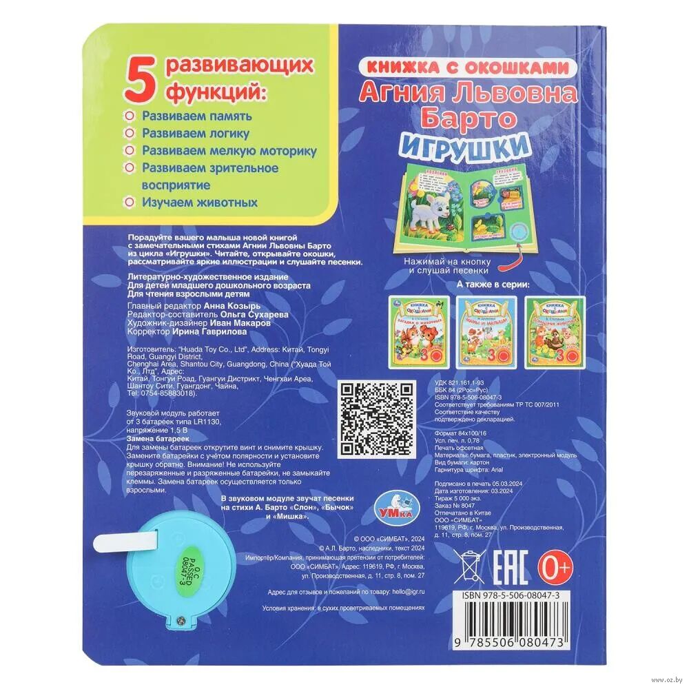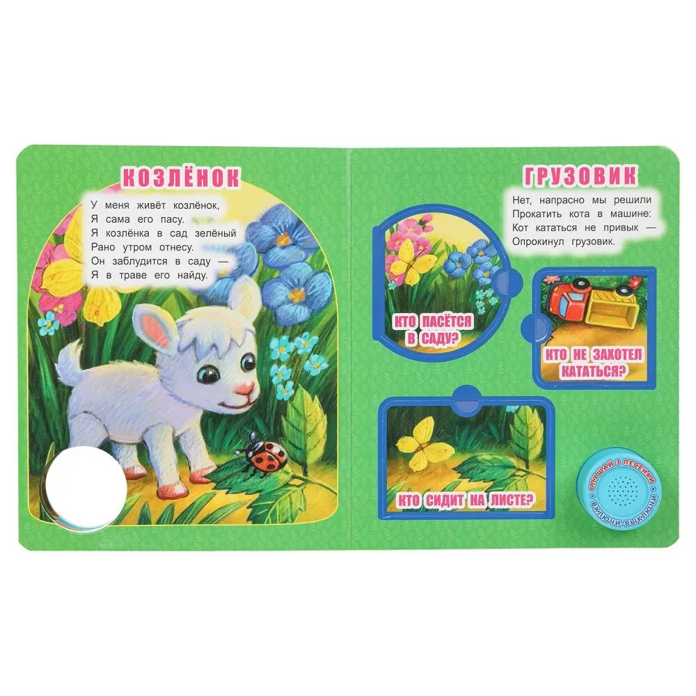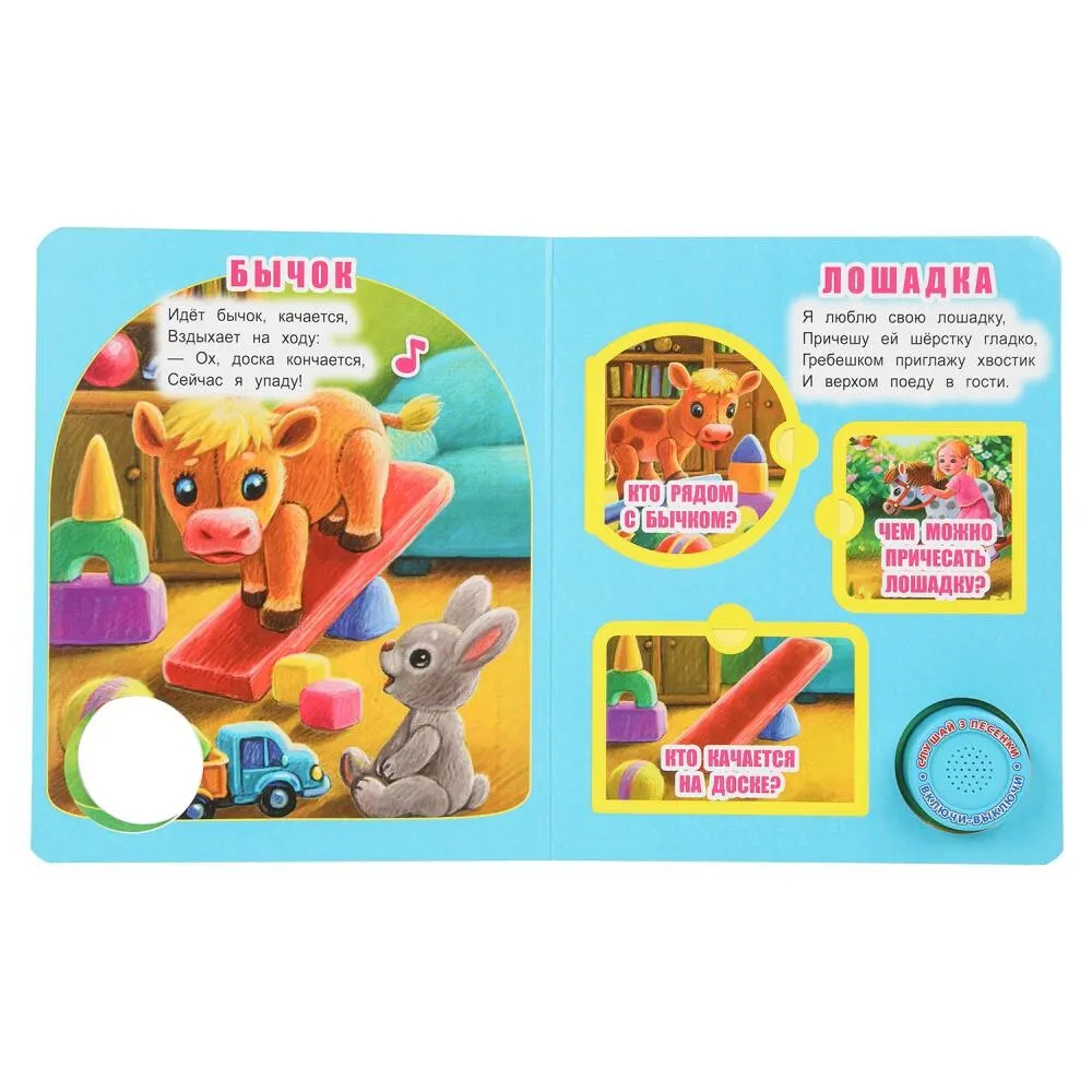 Ребенок с удовольствием будет листать плотные страницы, рассматривать яркие картинки, открывать окошки и смотреть, что там спряталось. Вместе с родителями он почитает любимые стихи, а также самостоятельно сможет понажимать на звуковую кнопку и послушать мелодичные песенки. Малыш легко освоит включение звука: по нажатию на кнопку включится первая песенка, при втором нажатии выключится, в 3-ий раз – заиграет следующая композиция и т.д. Благодаря компактному формату книгу удобно взять с собой в дорогу.