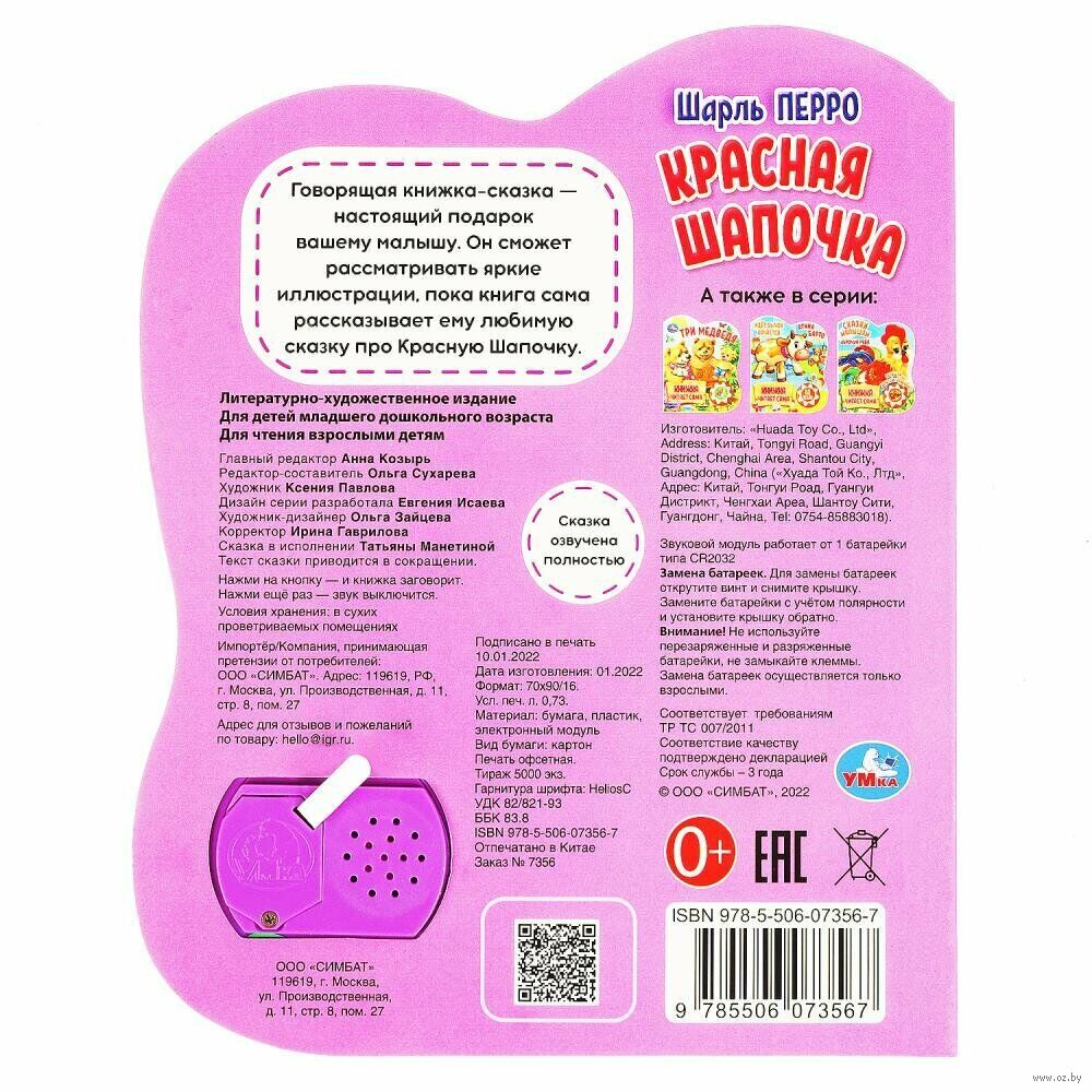 Малыш будет с удовольствием рассматривать яркие картинки, нажимать на кнопку и слушать любимую сказку – маме даже не придётся её читать, книга сделает это сама! Книжка сделана из плотного картона, поэтому родители могут не опасаться, что ребёнок её порвёт. Благодаря компактному формату книгу удобно брать с собой в путешествия.