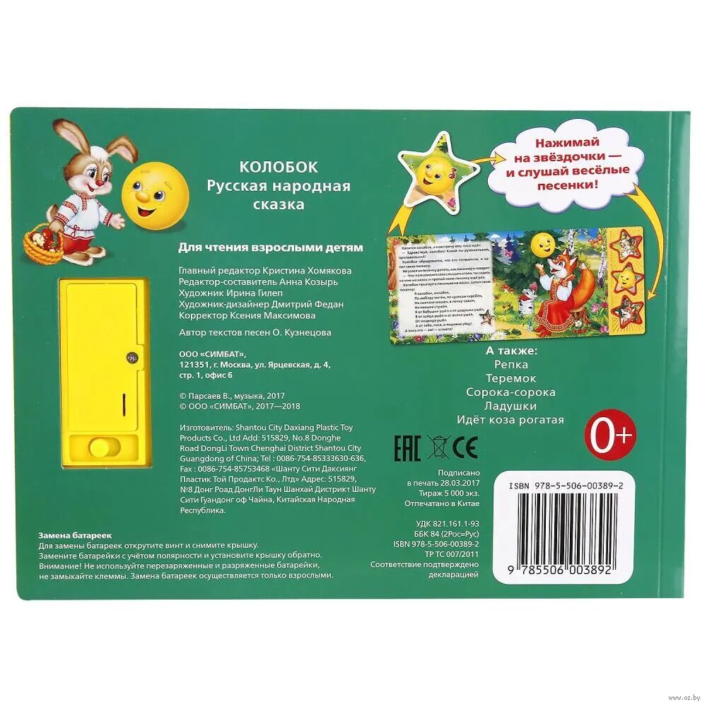 Ребенок с удовольствием будет листать плотные страницы, рассматривать яркие картинки, нажимать на кнопки и слушать веселые песенки по мотивам любимой сказки. Малыш легко освоит включение звука: по нажатию на кнопку звук включится, при втором нажатии выключится. Благодаря компактному формату книгу удобно взять с собой в дорогу.