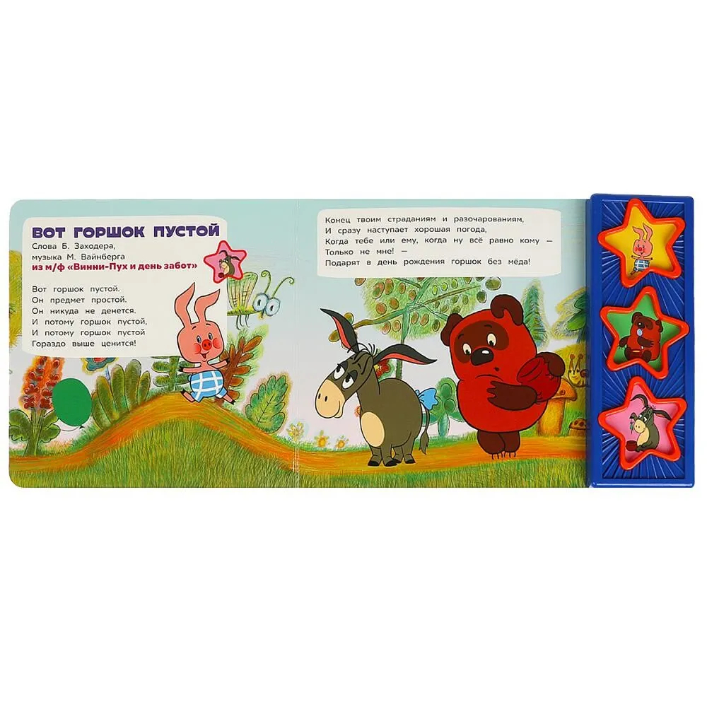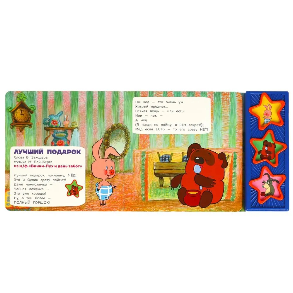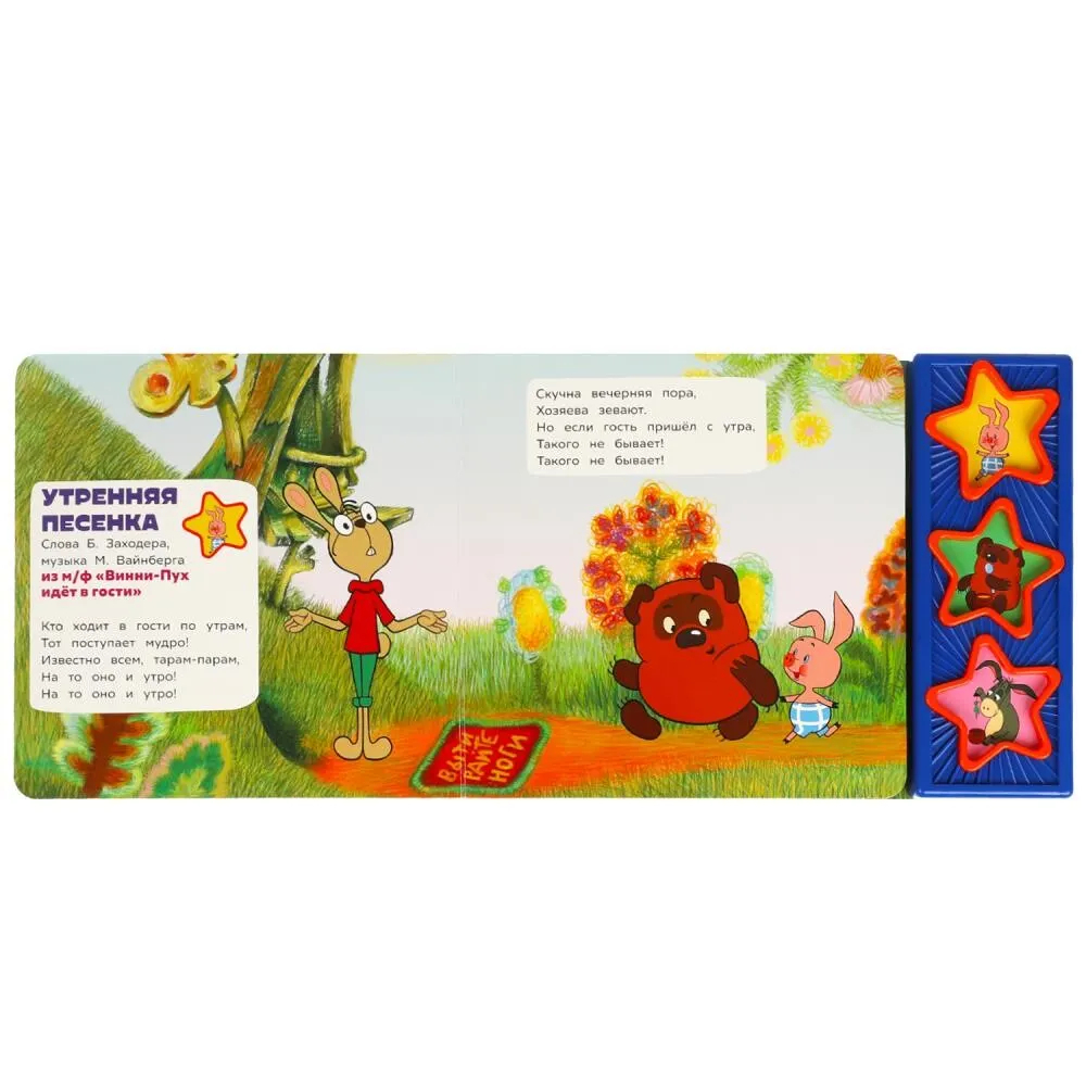 Ребенок с удовольствием будет листать плотные страницы, рассматривать яркие картинки и, конечно, нажимать на кнопки и слушать песенки из популярного мультфильма про забавного медвежонка Винни-Пуха и его друзей. Малыш легко освоит включение звука: по нажатию на кнопку песенка включится, при втором нажатии выключится. Благодаря компактному размеру книгу удобно взять с собой в дорогу.