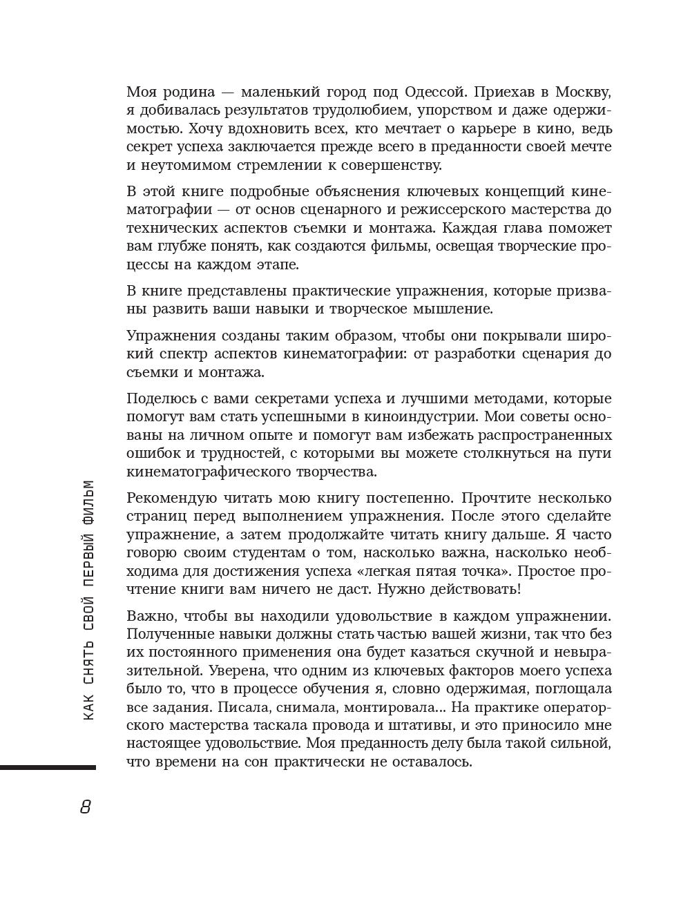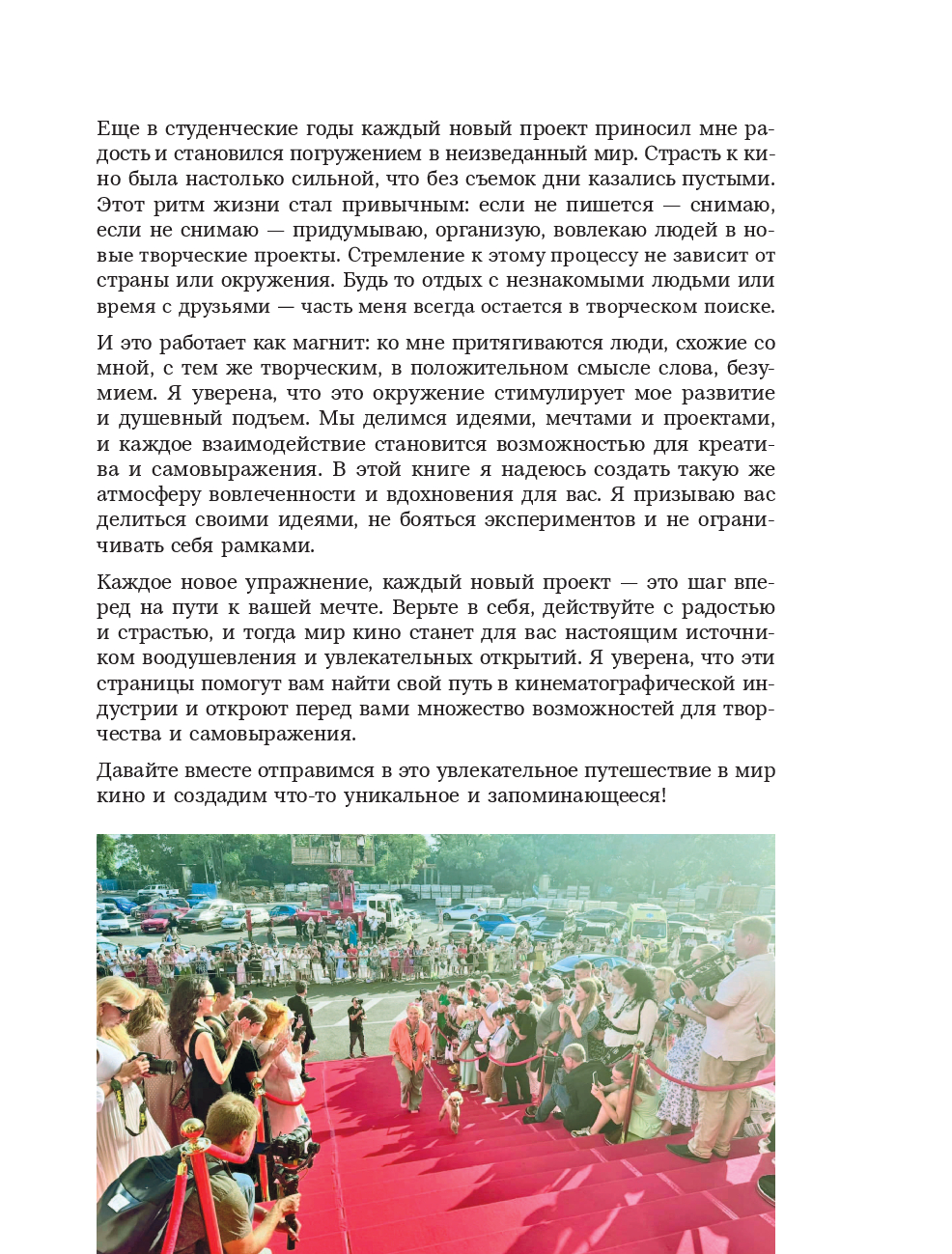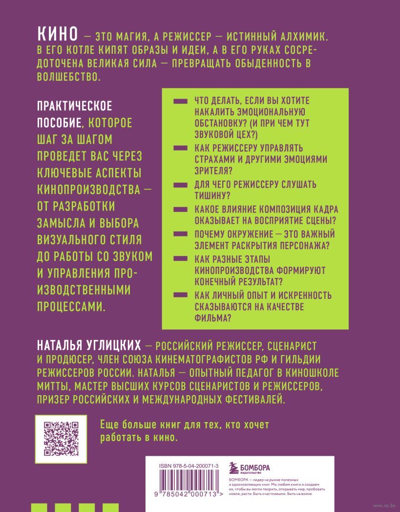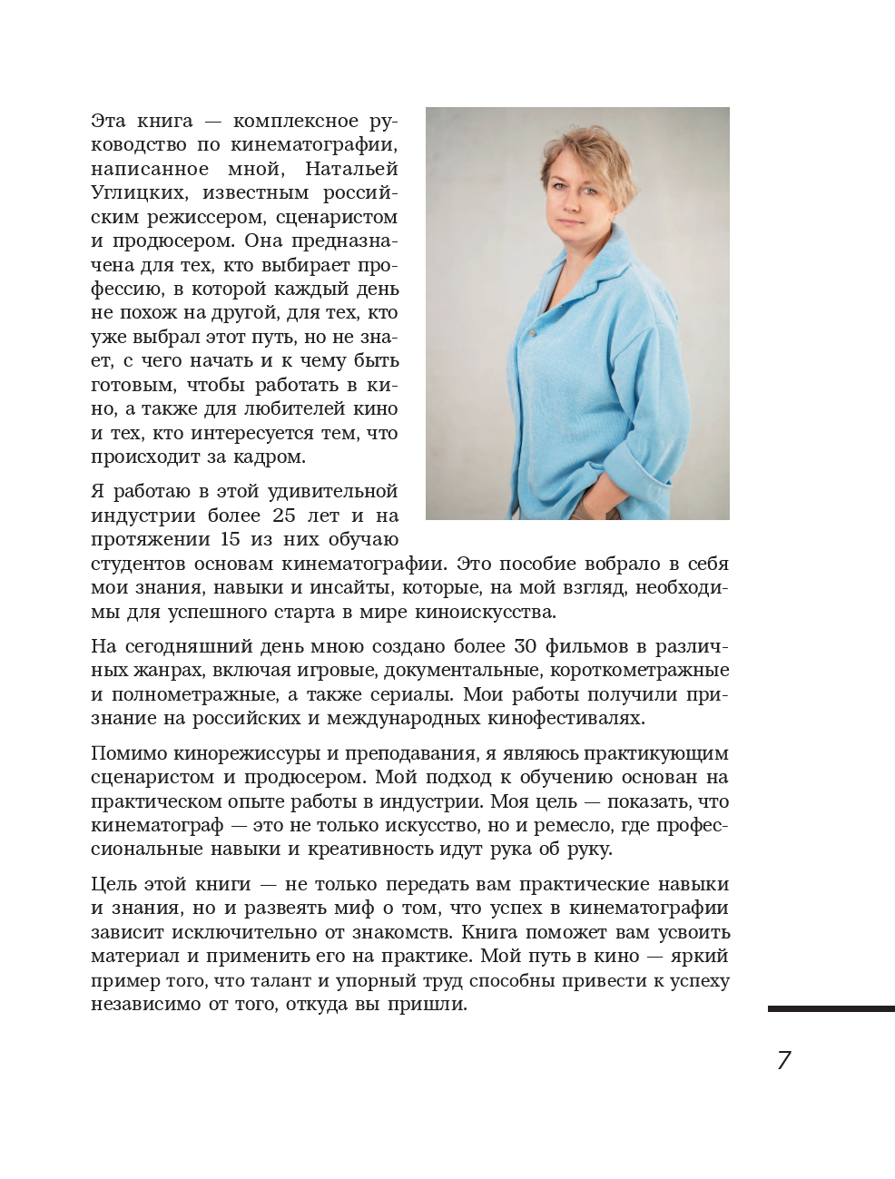 В данной книге опытный российский режиссёр, сценарист и продюсер Наталья Углицких помогает разобраться во всех этапах кинопроизводства – от формирования идеи до её реализации на экране. Автор подробно рассматривает важные аспекты индустрии, включая выбор жанра, разработку сценария, а также организацию производственного процесса. Книга служит практическим руководством для начинающих кинематографистов, стремящихся понять структуру и динамику работы в индустрии. Особое внимание уделяется прикладным упражнениям, которые помогут читателю отработать основные навыки, необходимые для успешной работы режиссера. Многочисленные примеры из собственного опыта, более 20 лет преподавания режиссуры и драматургии в ГИТЕР, МИТРО, ВКСР, Киношколе Александра Митты и искренняя любовь к своему делу позволяют Наталье приоткрыть завесу тайны и рассказать, как все-таки снять свой первый фильм.