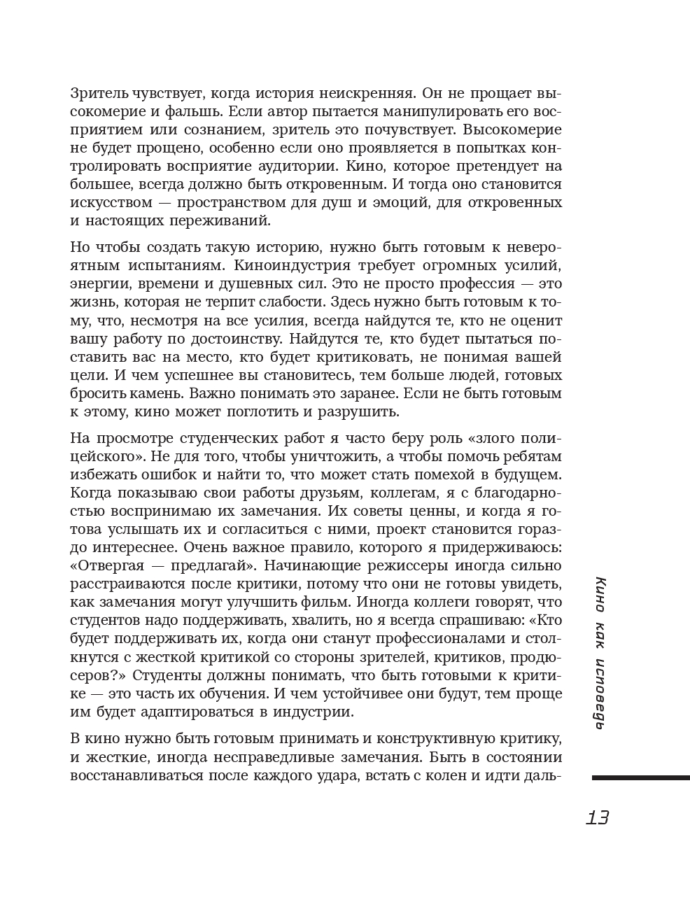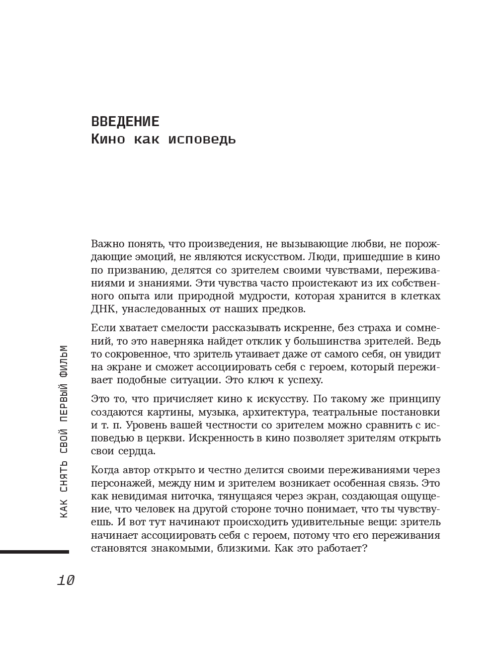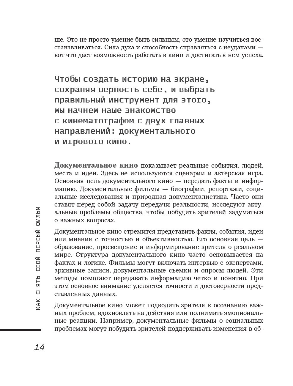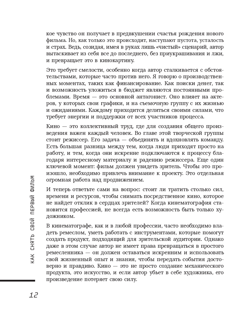 В данной книге опытный российский режиссёр, сценарист и продюсер Наталья Углицких помогает разобраться во всех этапах кинопроизводства – от формирования идеи до её реализации на экране. Автор подробно рассматривает важные аспекты индустрии, включая выбор жанра, разработку сценария, а также организацию производственного процесса. Книга служит практическим руководством для начинающих кинематографистов, стремящихся понять структуру и динамику работы в индустрии. Особое внимание уделяется прикладным упражнениям, которые помогут читателю отработать основные навыки, необходимые для успешной работы режиссера. Многочисленные примеры из собственного опыта, более 20 лет преподавания режиссуры и драматургии в ГИТЕР, МИТРО, ВКСР, Киношколе Александра Митты и искренняя любовь к своему делу позволяют Наталье приоткрыть завесу тайны и рассказать, как все-таки снять свой первый фильм.