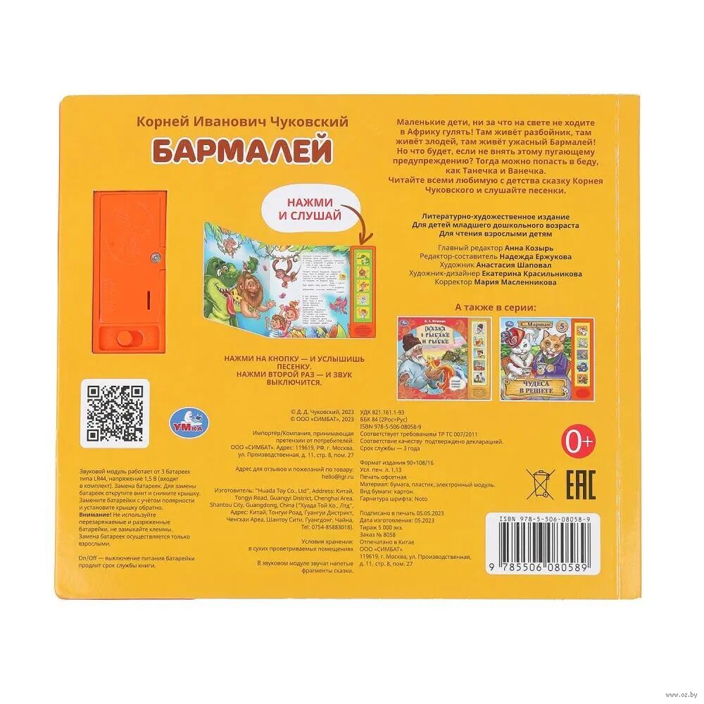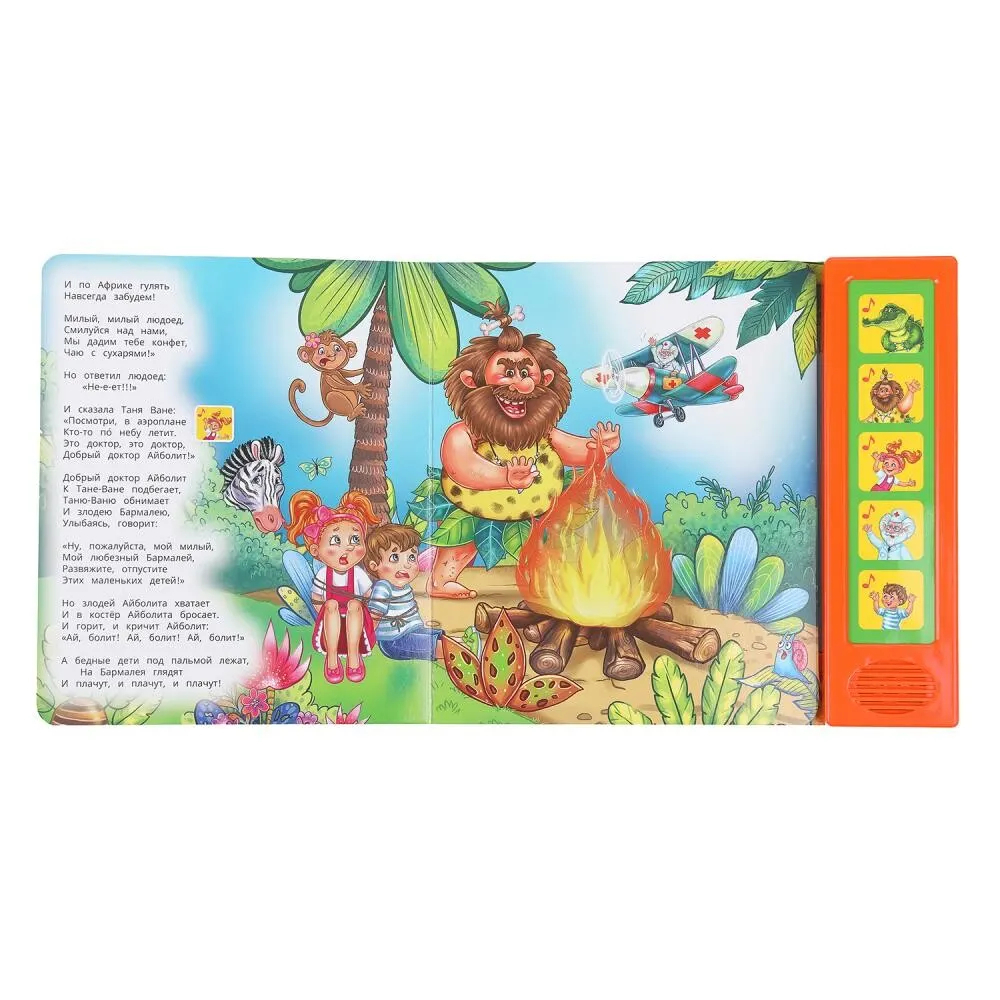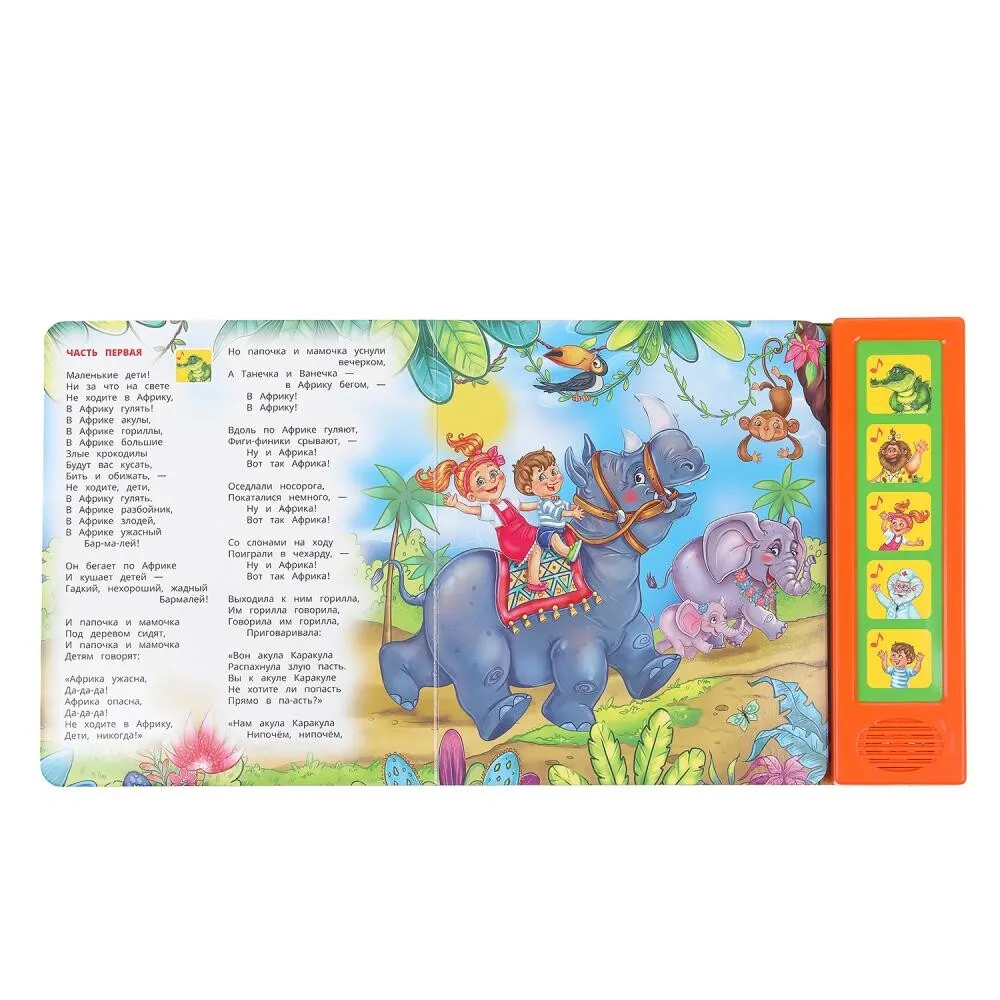 Ребенок с удовольствием будет листать плотные страницы, рассматривать яркие картинки, нажимать на кнопки и слушать известную стихотворную сказку Корнея Чуковского. Малыш легко освоит включение звука: по нажатию на кнопку звук включится, при втором нажатии выключится. Благодаря компактному размеру книгу удобно брать с собой в дорогу.