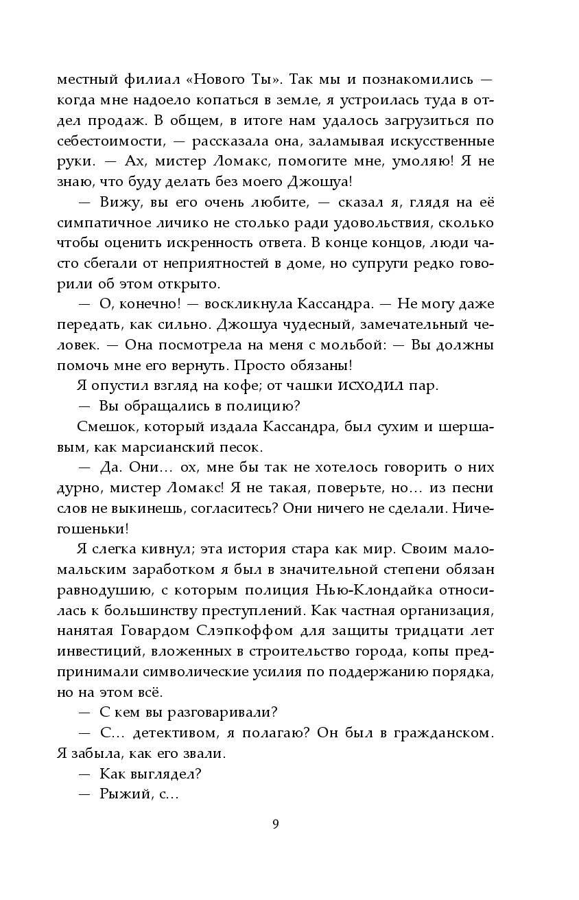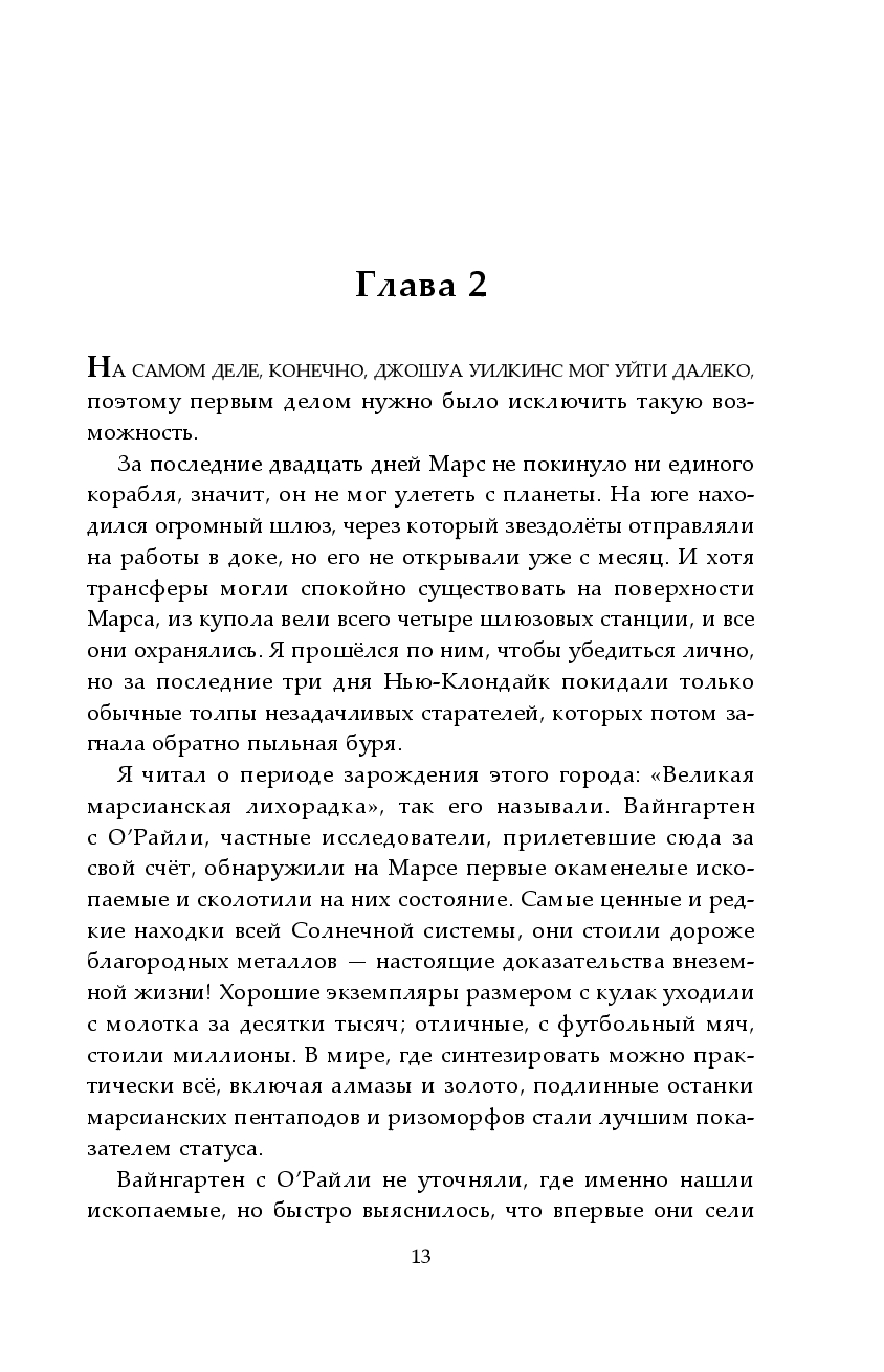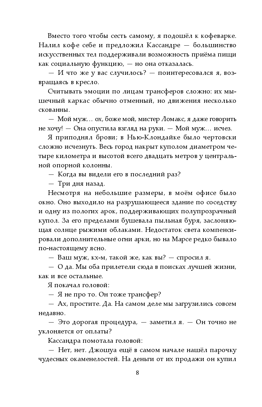 Александр Ломекс, единственный частный детектив на Марсе, работает в обществе незадачливых старателей, чиновников-колонистов, коррумпированных полицейских и богачей-трансферов, которые загружают свои разумы в бессмертные тела андроидов. Улики приводят его к старому делу об убийстве Вайнгартена и О’Райли и их сокровищам времен Великой марсианской лихорадки. Теперь под прицелом оказывается и сам детектив.