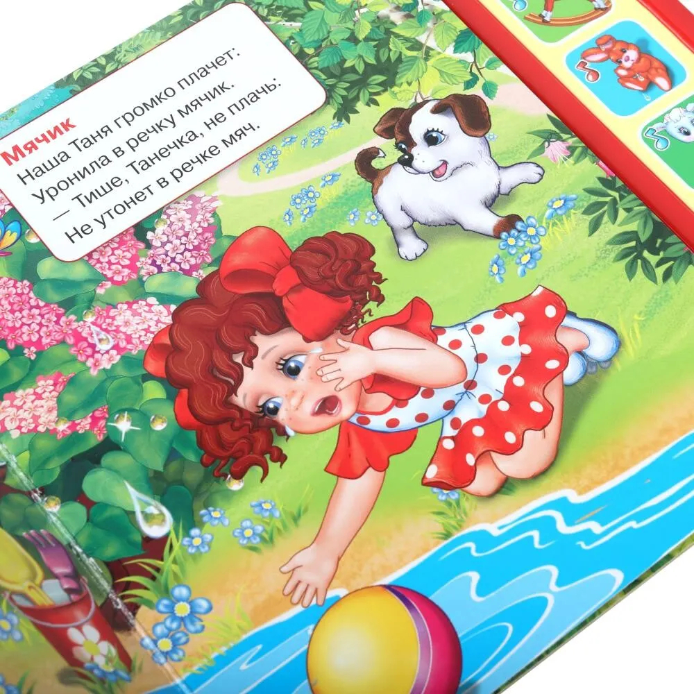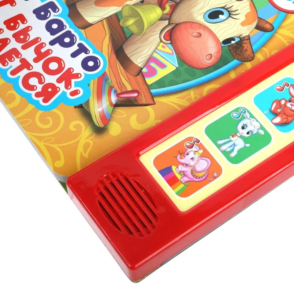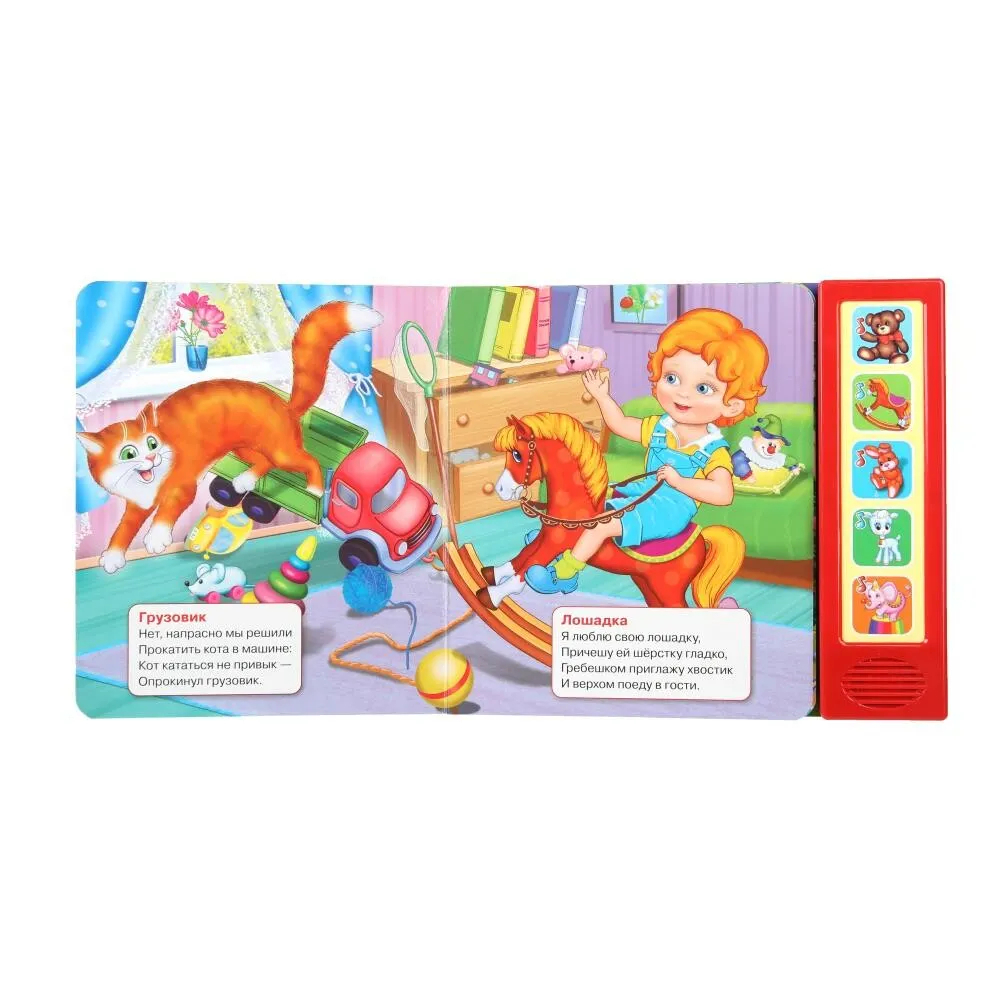 Ребенок будет с удовольствием рассматривать яркие иллюстрации, слушать стихи и песенки на них. Он легко освоит включение звука: по нажатию на кнопку звук включится, при втором нажатии выключится. На каждой кнопочке записано по 2 песенки. Книга сделана из плотного картона, поэтому родители могут не опасаться, что ребенок порвет странички. Благодаря удобному формату книгу можно взять с собой в путешествие.