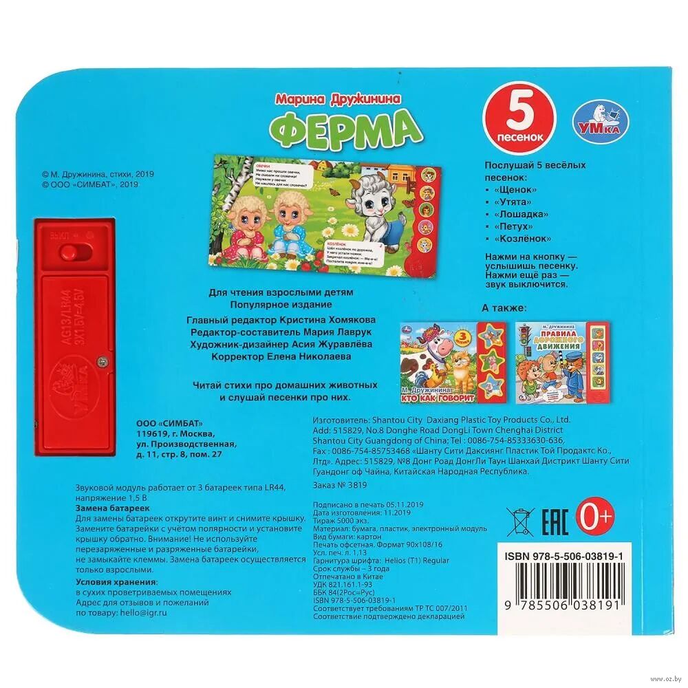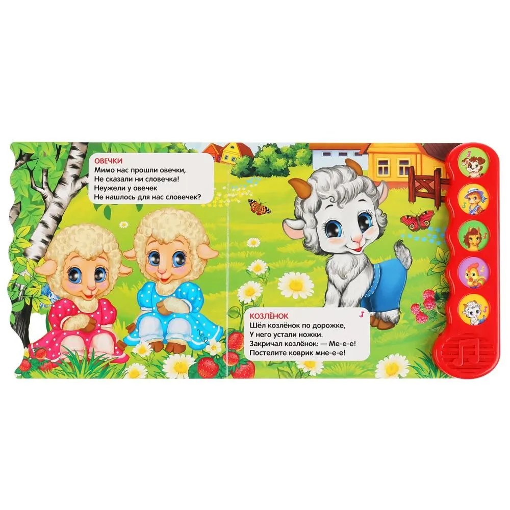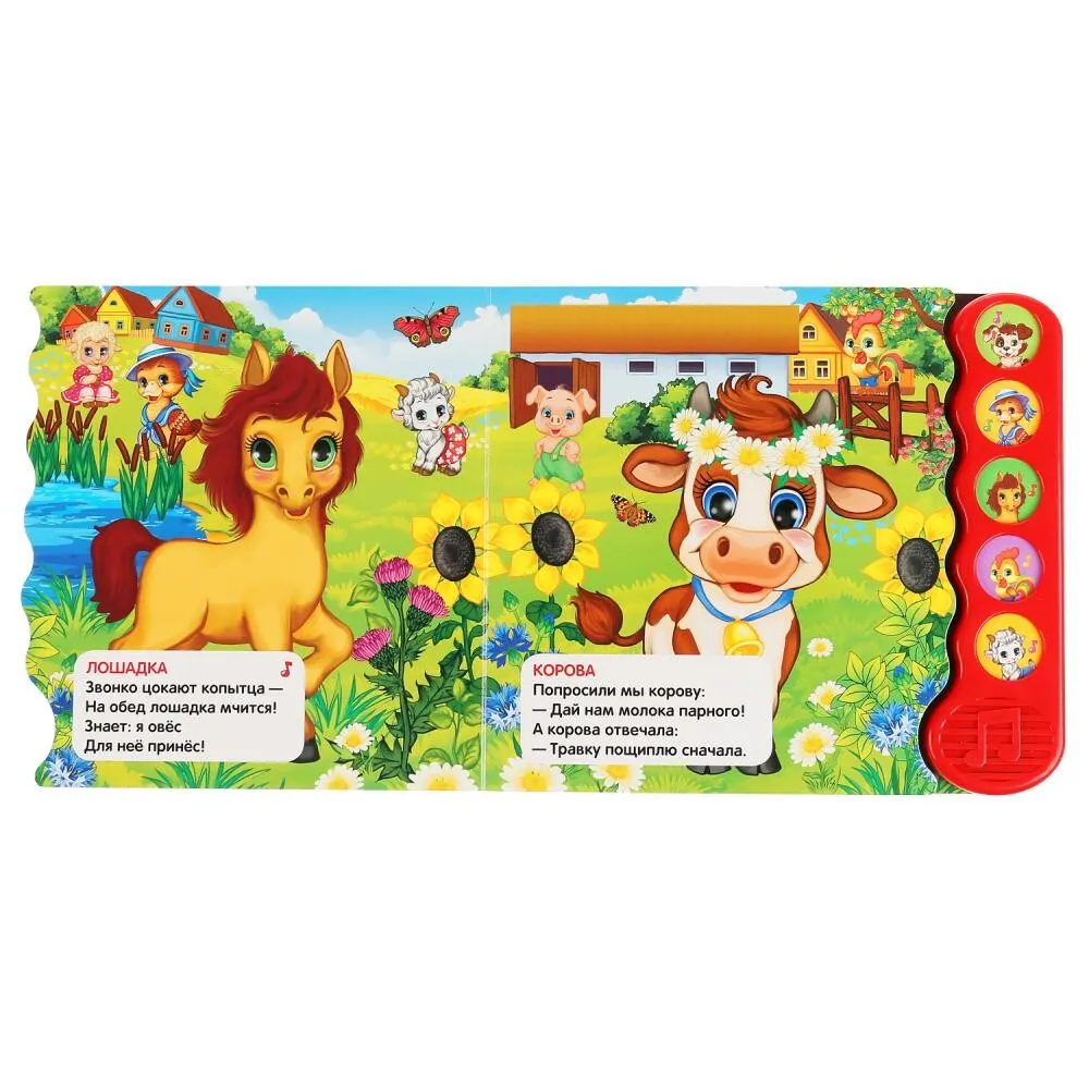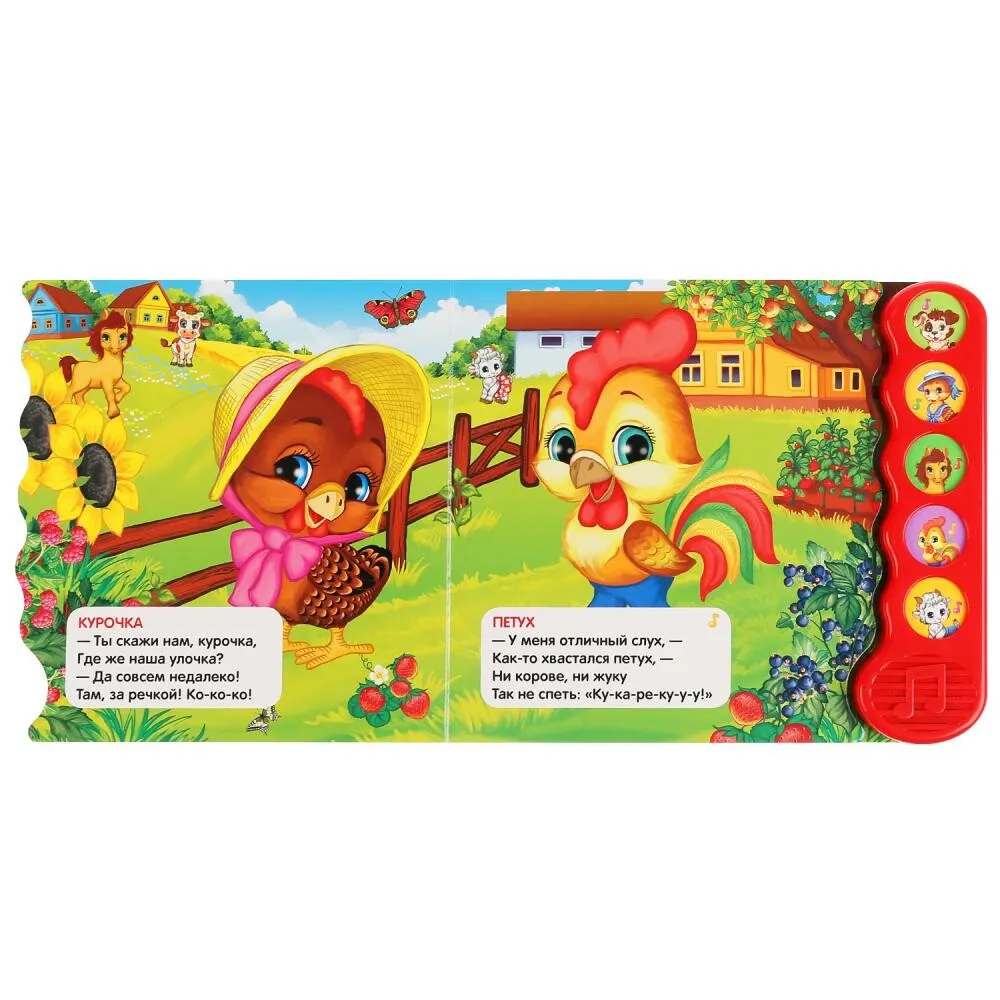 Красочная музыкальная книга познакомит малыша с домашними животными, которые живут на ферме. А песенки сделают чтение еще более увлекательным. Ребенок легко освоит включение звука: по нажатию на кнопку звук включится, при втором нажатии выключится. Композиции исполняются профессиональными артистами. Книжка сделана из плотного картона, поэтому родители могут не опасаться за ее сохранность. Благодаря компактному формату ее удобно брать с собой.