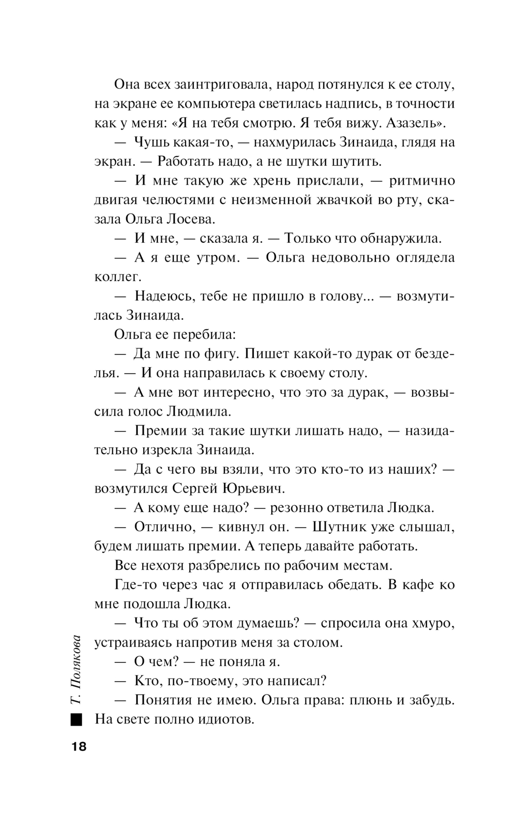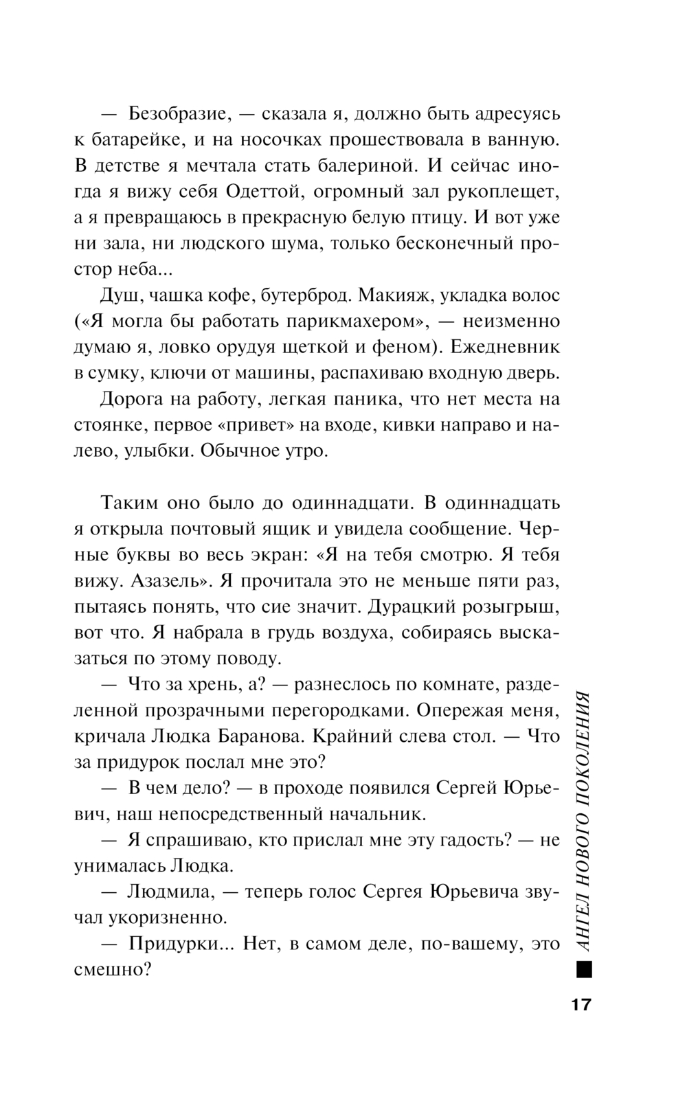 Что бы вы подумали, получив по электронной почте послание от Азазеля – ангела смерти? Чья-то дурацкая шутка! Вот и Ульяна Осипова подумала так же. Но когда погибли две ее коллеги, получившие такое же послание, она поняла, что это – увы! – не шутка. Кто-то ловко манипулирует ею, преследуя свои явно недобрые цели. Ульяне пришлось покопаться в истории, узнать о существовании "Пятого евангелия", увидеть труп человека, замурованного в стене и… ничуть не приблизиться к разгадке Азазеля…