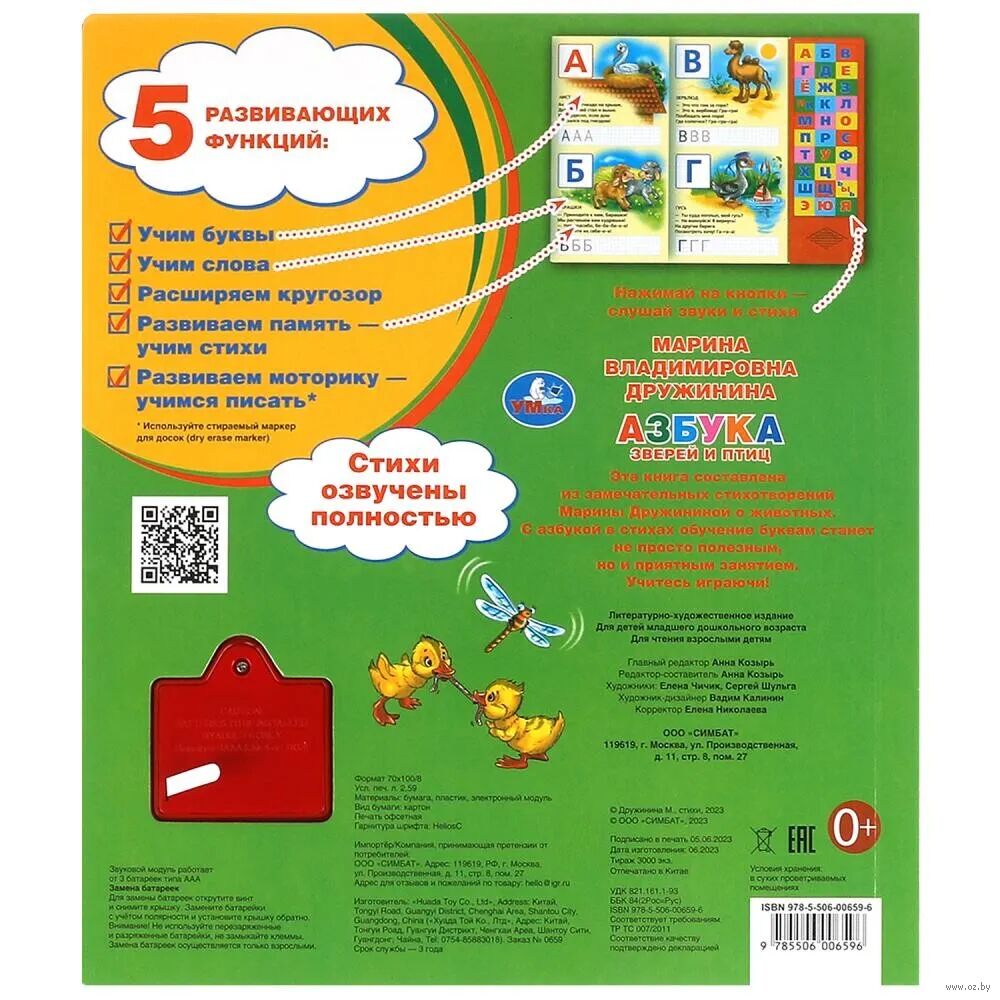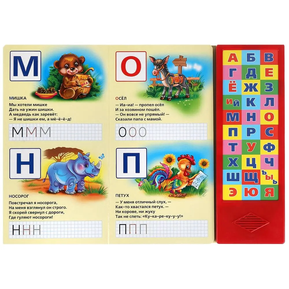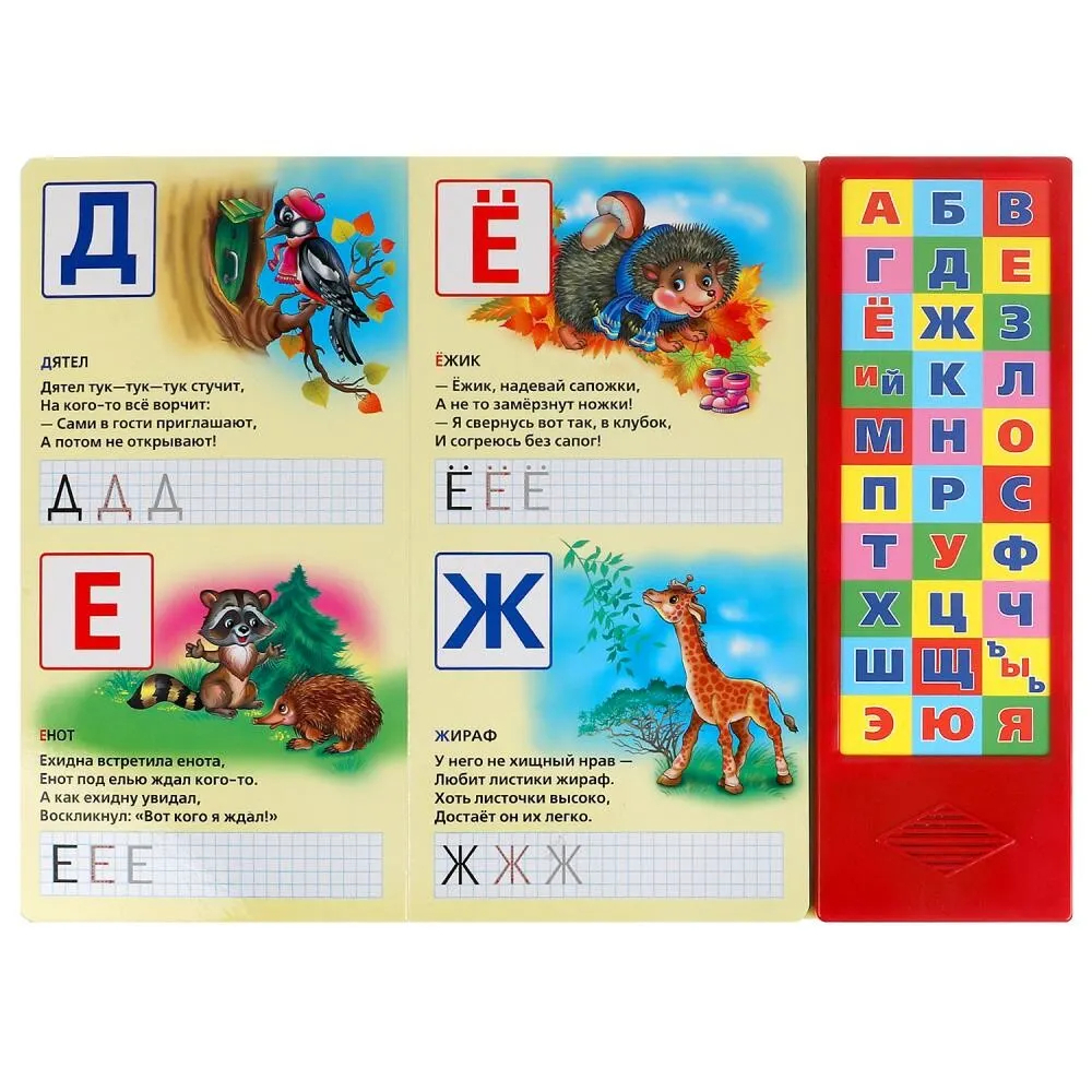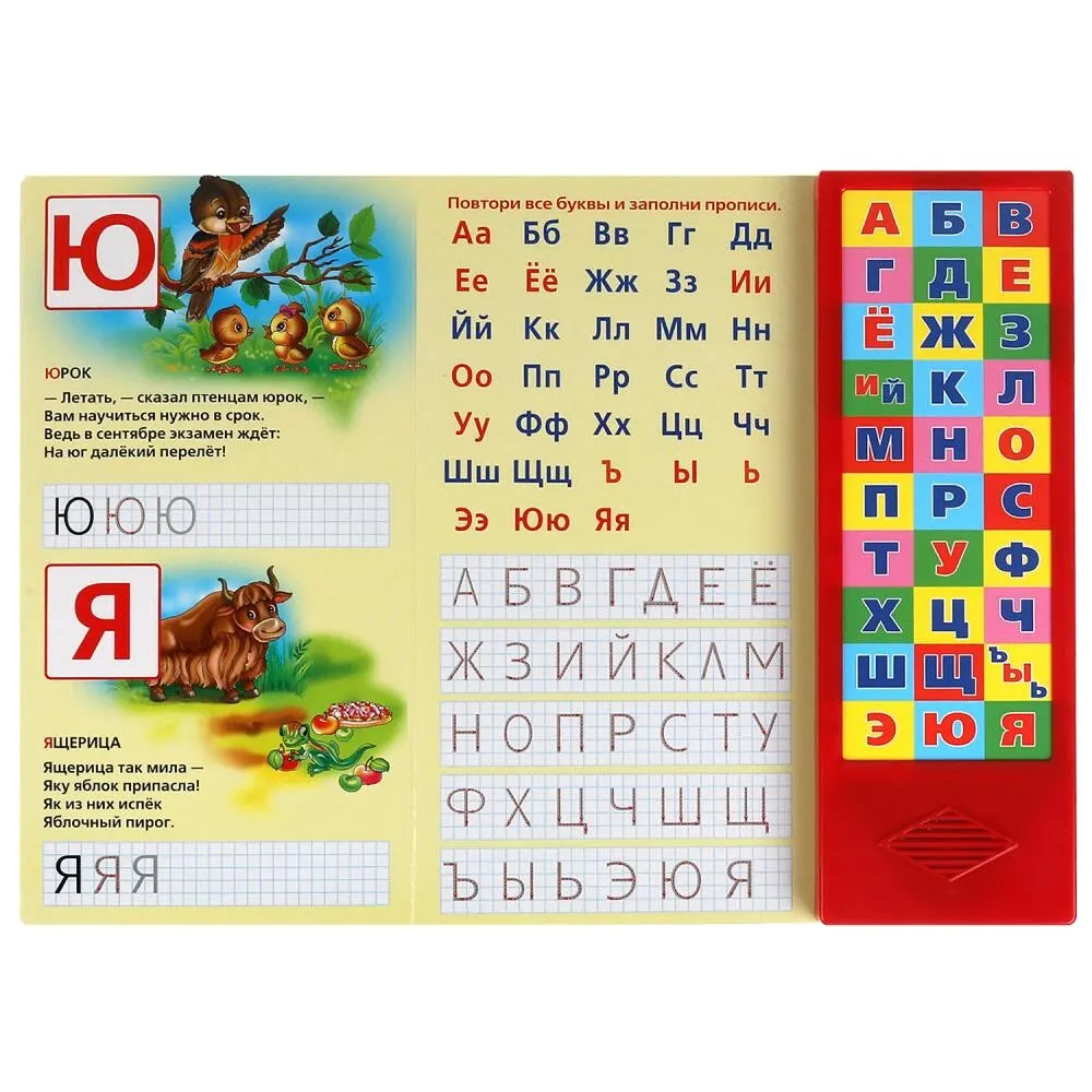 В игровой форме дети усваивают информацию в разы быстрее. Эта яркая книга со стихами известного детского автора поможет ребенку не только познакомиться с азбукой, но и послушать их верное произношение, а также потренировать правописание букв в прописях. Книга сделана из плотного картона, поэтому родители могут не опасаться, что ребенок порвет странички.