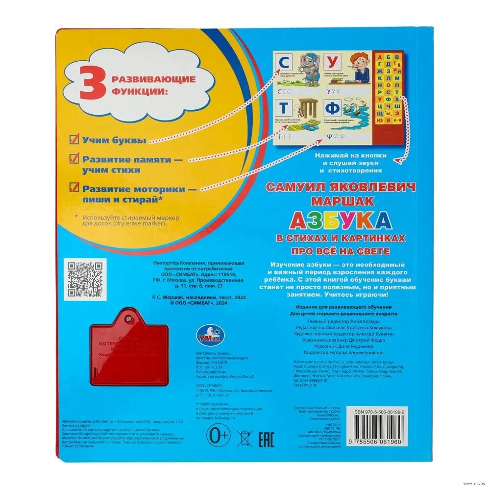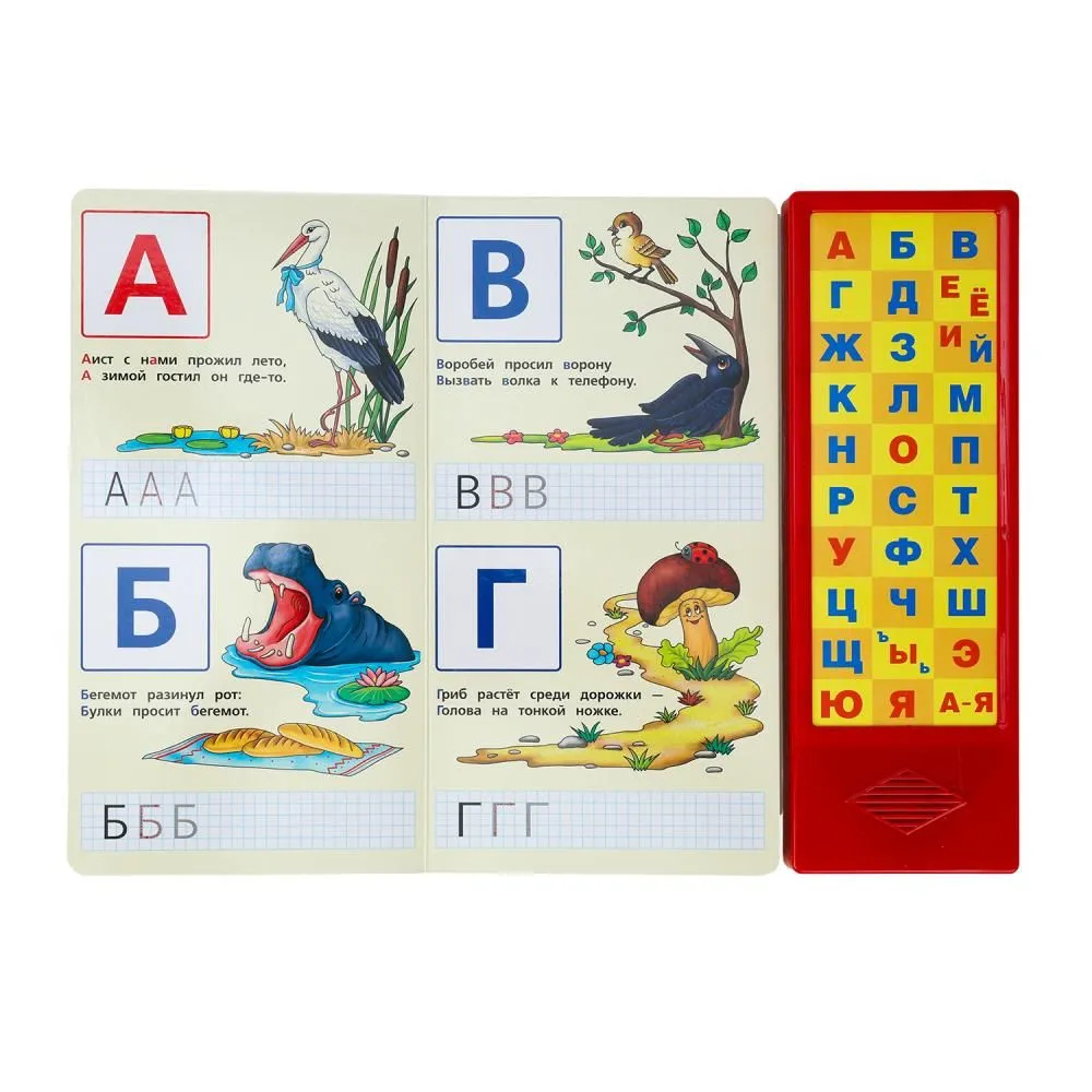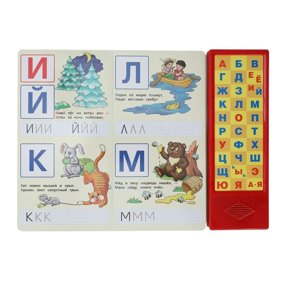 Эта яркая книга непременно привлечёт внимание малыша красивыми картинками, объёмными буквами и звуковыми кнопками. Он с удовольствием будет листать красочные страницы, слушать занимательные стихи и учить азбуку. Книга сделана из плотного картона, поэтому мамы могут не опасаться, что ребёнок порвёт странички.