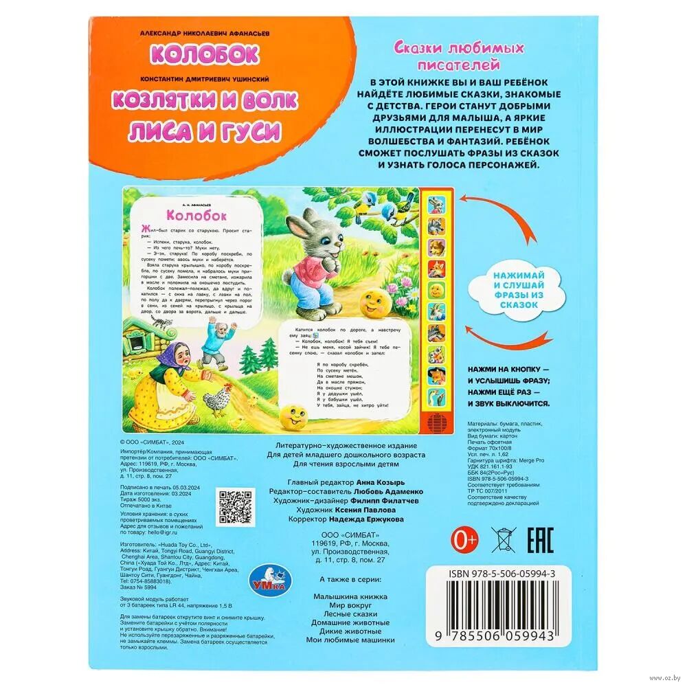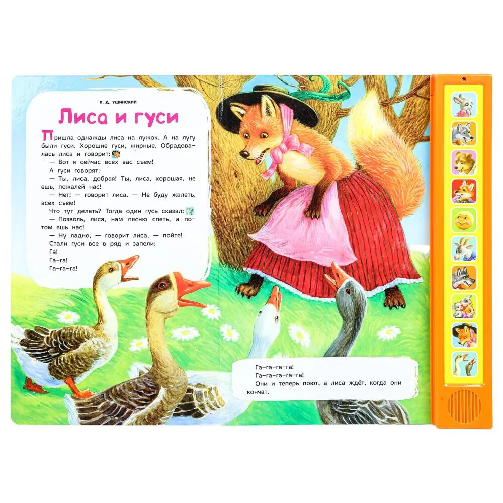 Эта яркая книга со сказками непременно понравится малышу. Герои станут его добрыми друзьями, а яркие картинки перенесут его в мир волшебства и фантазии. Ребенок сможет послушать фразы из сказок и узнать голоса персонажей. Книжка сделана из плотного картона, поэтому родители могут не опасаться за ее сохранность.