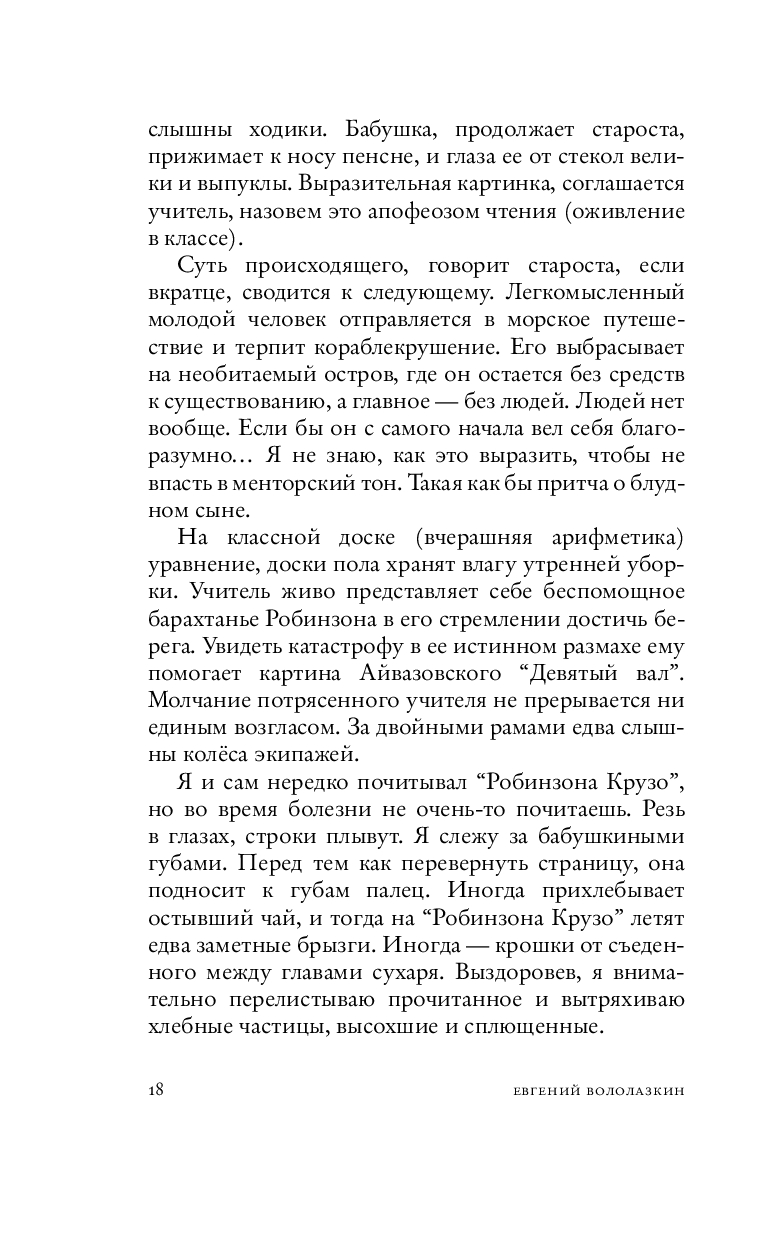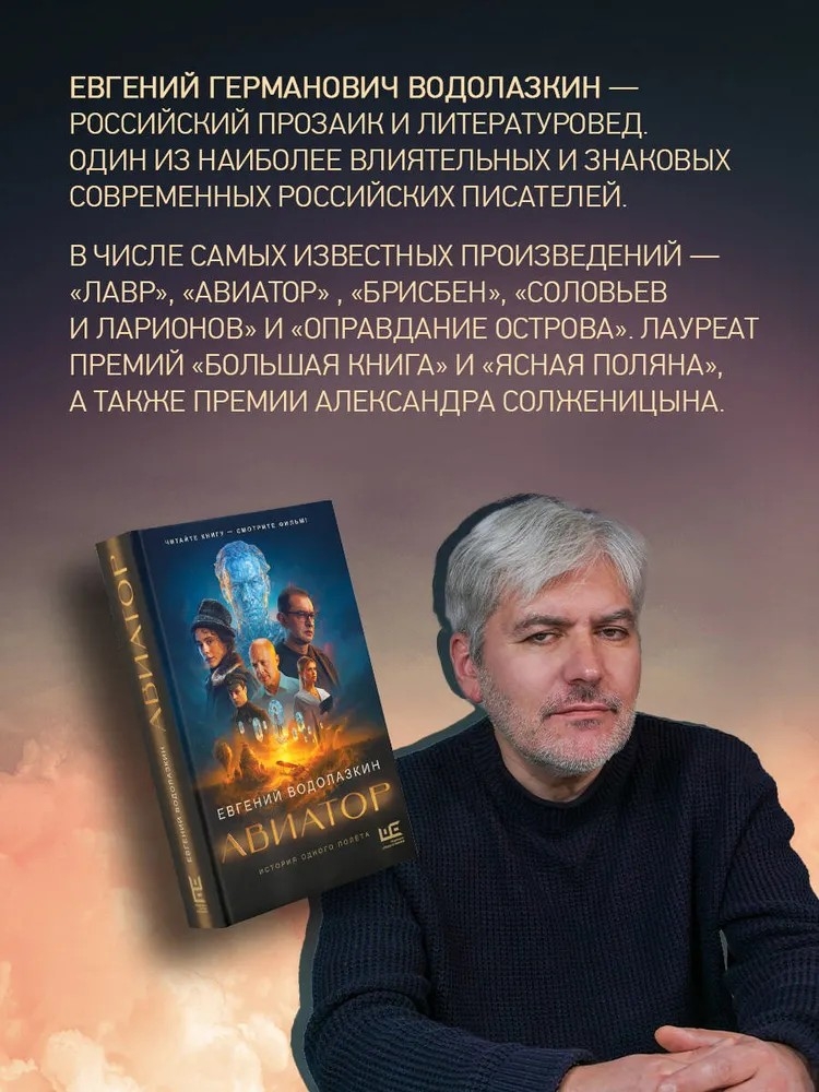 "Евгений Водолазкин – прозаик, филолог. Автор бестселлера "Лавр" и изящного historical fiction "Соловьев и Ларионов". В России его называют "русским Умберто Эко", в Америке – после выхода "Лавра" на английском – "русским Маркесом". Ему же достаточно быть самим собой. Произведения Водолазкина переведены на многие иностранные языки.
