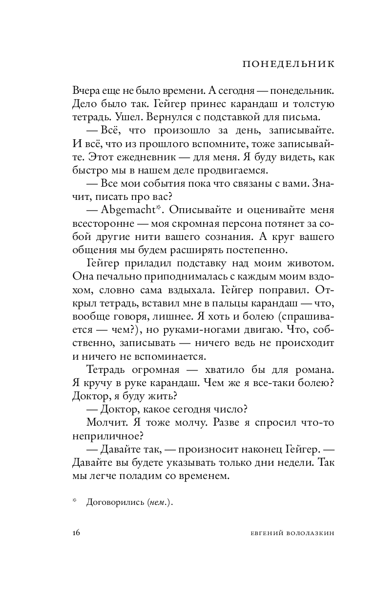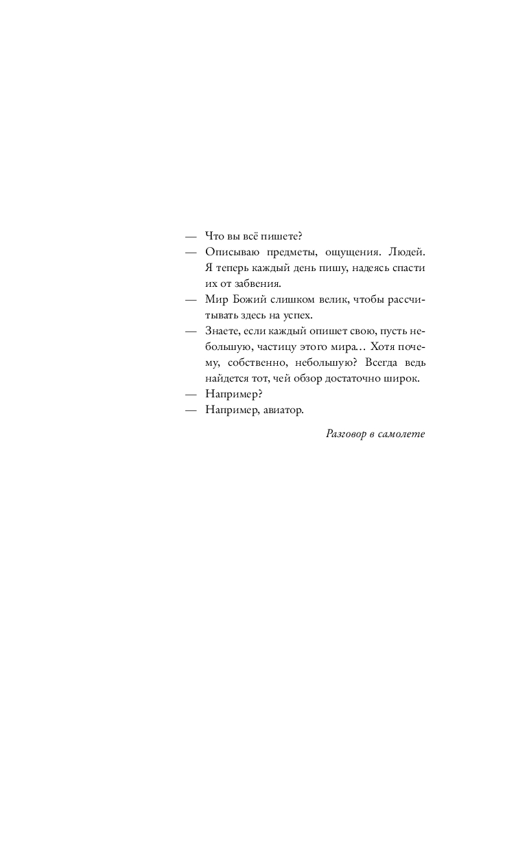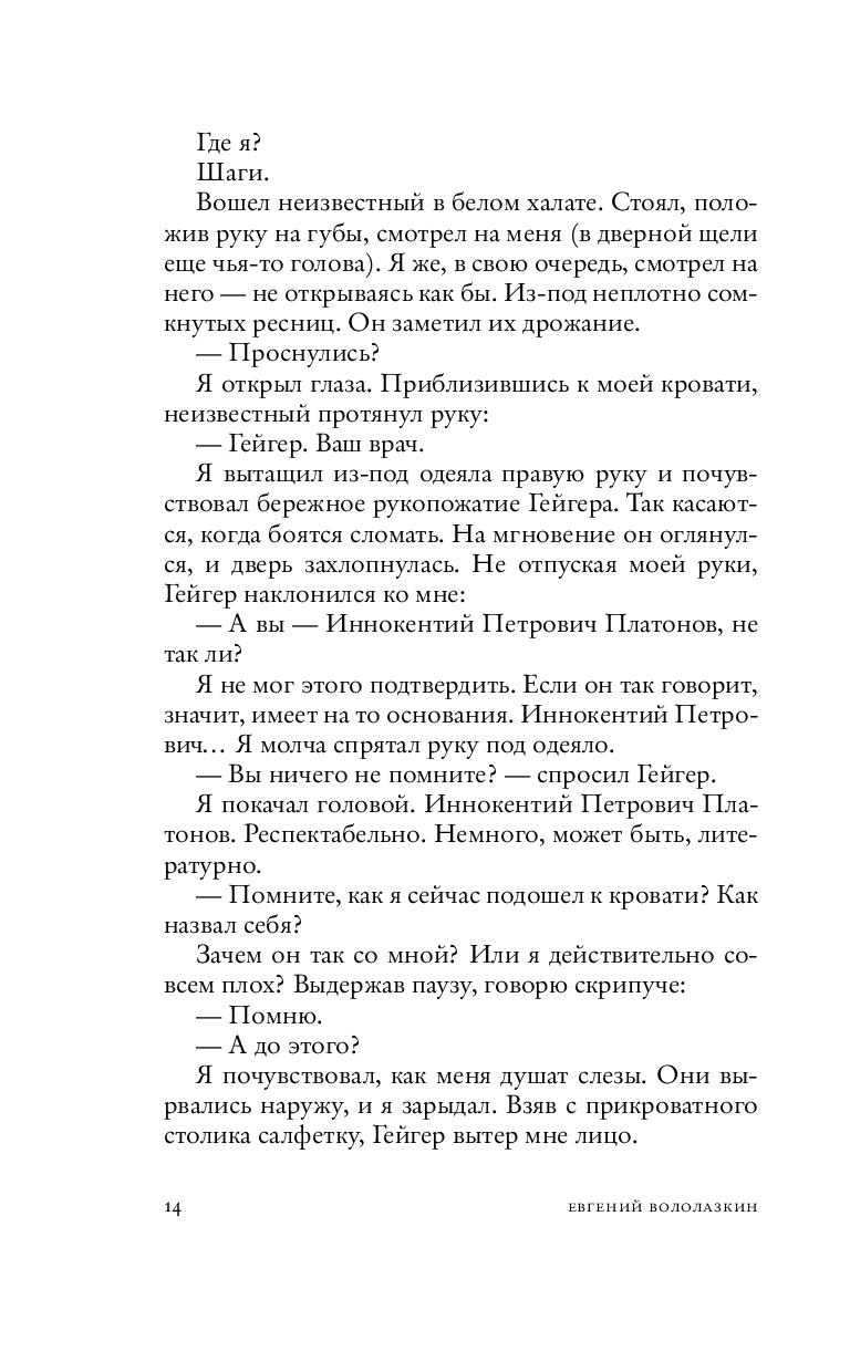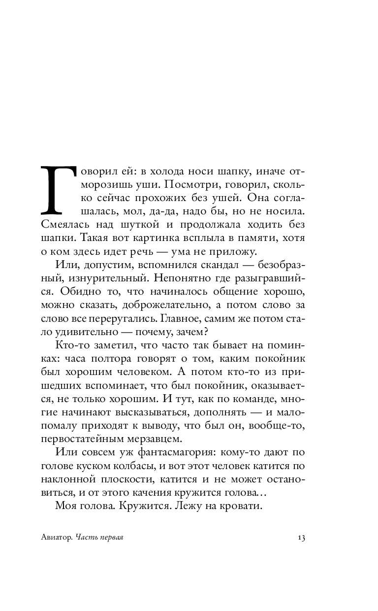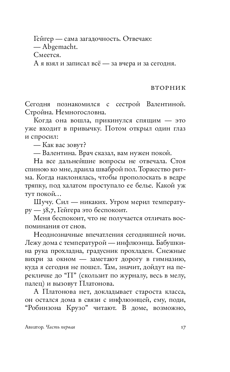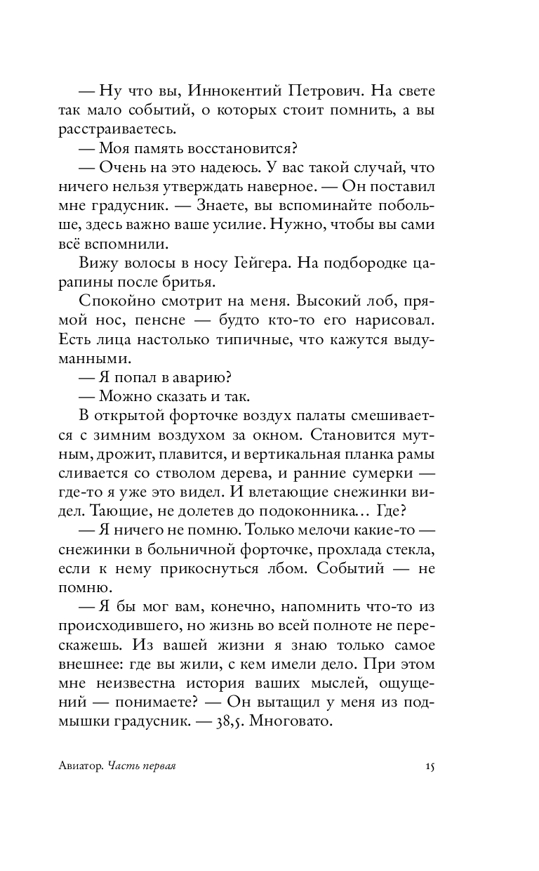 Герой нового романа "Авиатор" – человек в состоянии tabula rasa: очнувшись однажды на больничной койке, он понимает, что не знает про себя ровным счетом ничего – ни своего имени, ни кто он такой, ни где находится. В надежде восстановить историю своей жизни, он начинает записывать посетившие его воспоминания, отрывочные и хаотичные: Петербург начала ХХ века, дачное детство в Сиверской и Алуште, гимназия и первая любовь, революция 1917‑го, влюбленность в авиацию, Соловки... Но откуда он так точно помнит детали быта, фразы, запахи, звуки того времени, если на календаре – 1999 год?.."