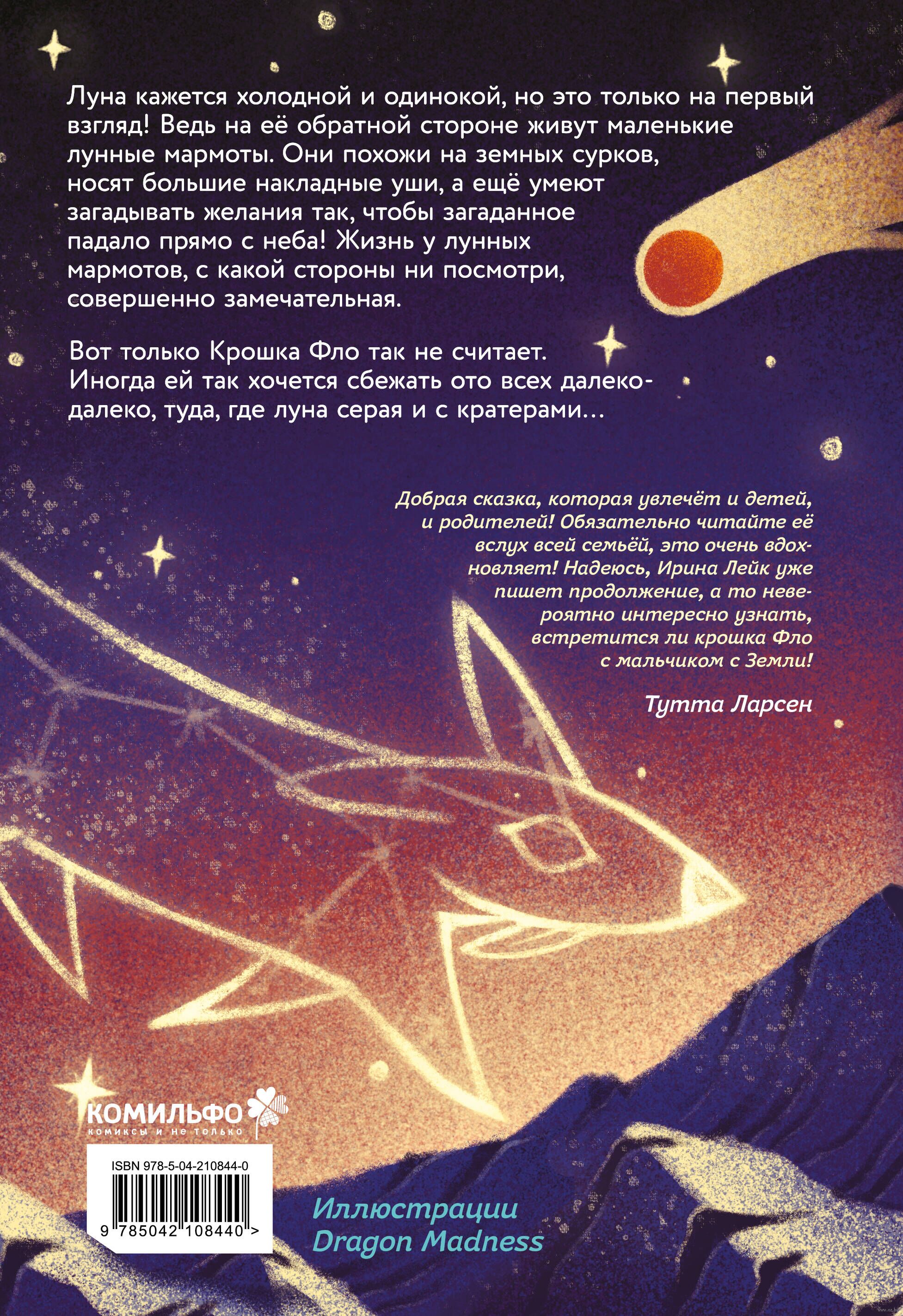 Луна кажется холодной и одинокой, но это только на первый взгляд! Ведь на её обратной стороне живут маленькие лунные мармоты. Они похожи на земных сурков, носят большие накладные уши, а ещё умеют загадывать желания так, чтобы загаданное падало прямо с неба! Жизнь у лунных мармотов, с какой стороны ни посмотри, совершенно замечательная. Вот только Крошка Фло так не считает. Иногда ей так хочется сбежать ото всех далеко-далеко, туда, где луна серая и с кратерами…