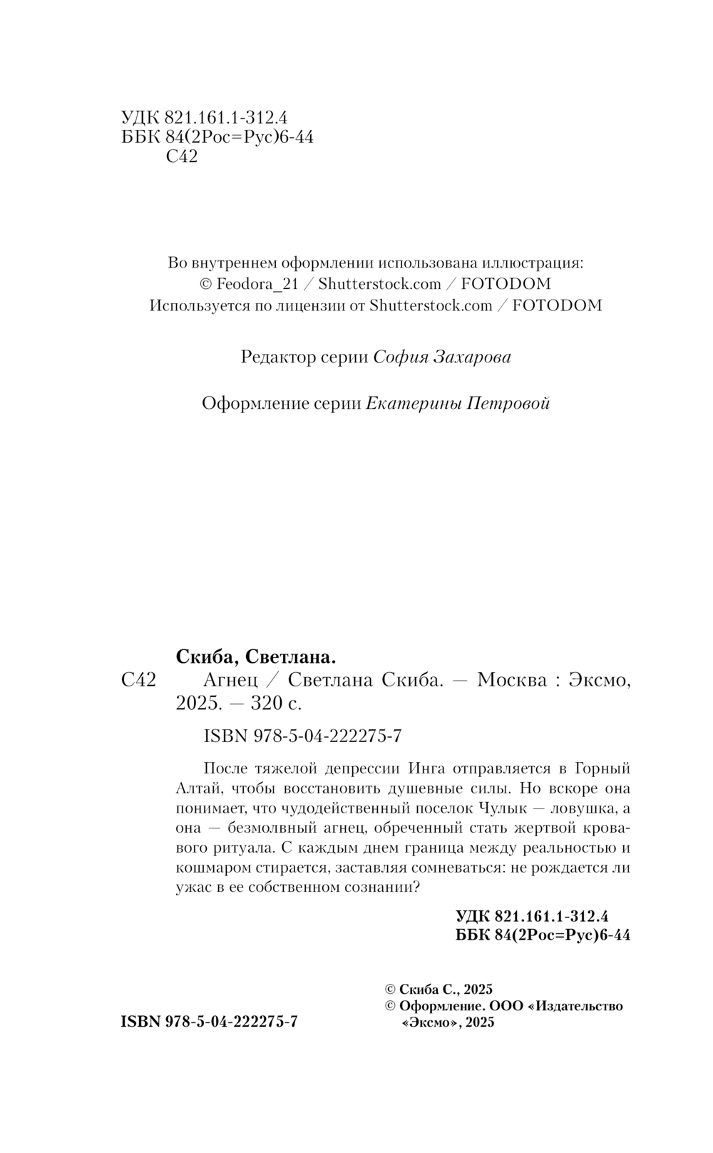 После тяжелой депрессии Инга отправляется в Горный Алтай, чтобы восстановить душевные силы. Но вскоре она понимает, что чудодейственный поселок Чулык – ловушка, а она – безмолвный агнец, обреченный стать жертвой кровавого ритуала. С каждым днем граница между реальностью и кошмаром стирается, заставляя сомневаться: не рождается ли ужас в ее собственном сознании?