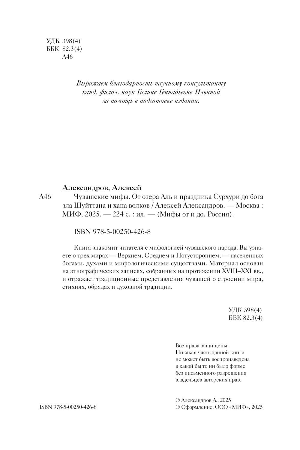 Книга знакомит читателя с мифологией чувашского народа. Вы узнаете о трех мирах – Верхнем, Среднем и Потустороннем, – населенных богами, духами и мифологическими существами. Материал основан на этнографических записях, собранных на протяжении XVIII–XXI вв., и отражает традиционные представления чувашей о строении мира, стихиях, обрядах и духовной традиции.