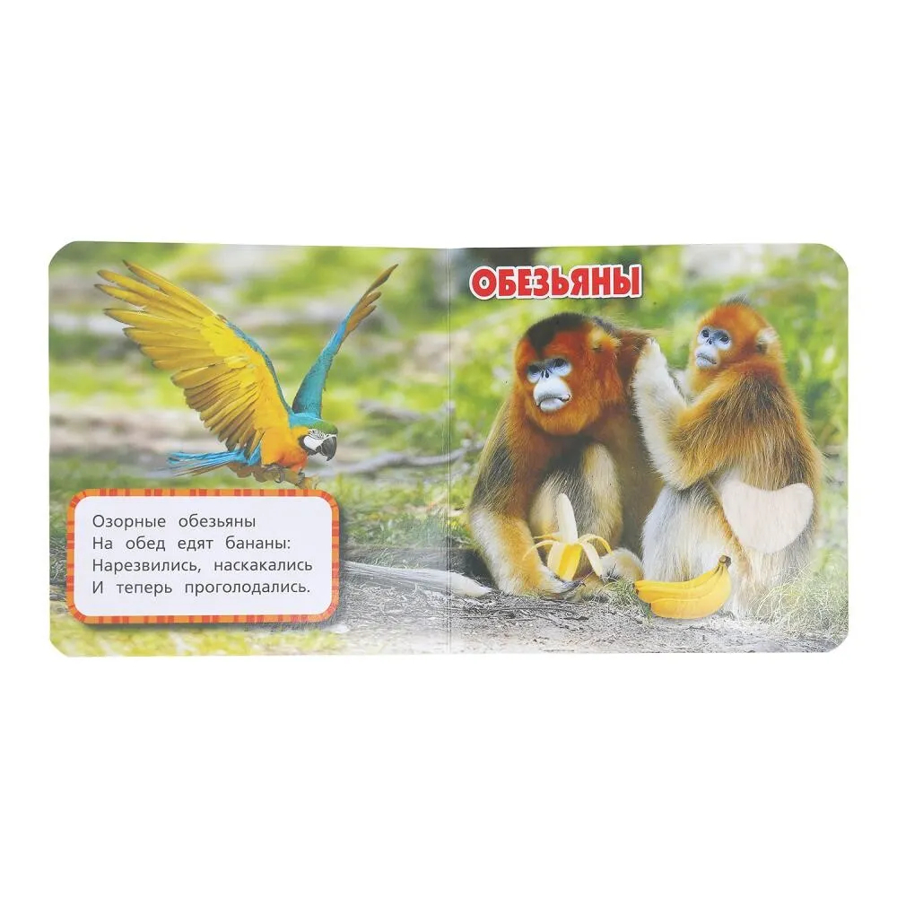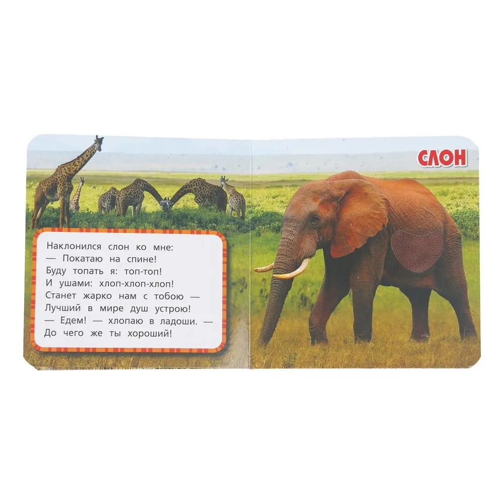 Книжка красивыми иллюстрациями и интересными стихами познакомит малыша с разными дикими животными. Для привлечения большего внимания ребенка к книге и развития его сенсорики на обложке и разворотах имеются элементы из приятных на ощупь мягких материалов. Благодаря компактному размеру издание удобно брать повсюду с собой.