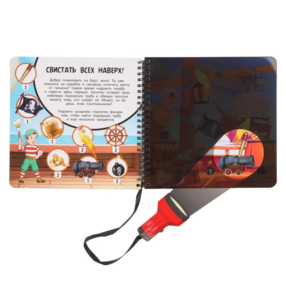 Эта удивительная книжка для тех, кто хочет почувствовать себя настоящим сыщиком, кто любит искать и находить. А поможет в поисках чудо-фонарик: просто поместите его между черной и цветной страницами и медленно водите, "подсвечивая" спрятанные на рисунке предметы. Такое увлекательное занятие обязательно понравится ребенку, он с удовольствием проведет время с этой книгой, а если позвать друзей, то поиски станут еще интереснее и веселее!