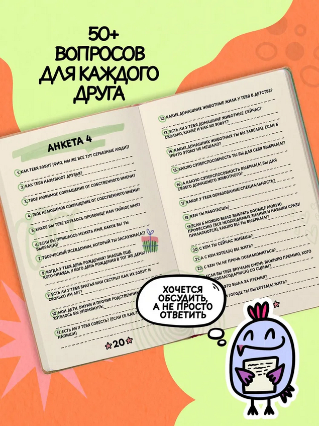Взрослому: Анкета поможет не просто приятно провести время, но и узнать себя и близких заново, обнаружить скрытые мечты, посмеяться и поделиться личным без излишней серьезности.