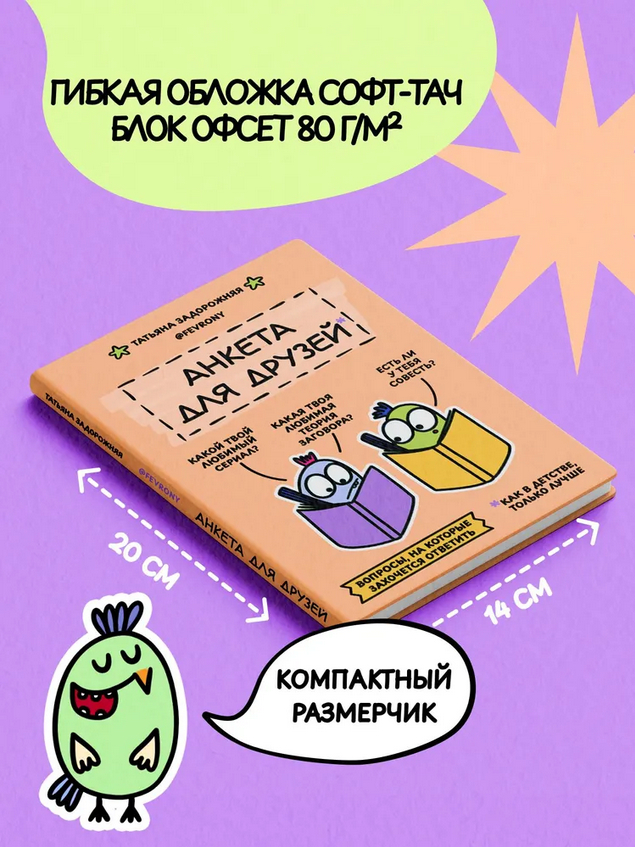 Вы держите в руках не просто блокнот с вопросами. Художница Татьяна Задорожняя @fevrony приглашает вас в настоящее путешествие в мир личности, фантазии и дружбы, наполненное юмором, вдохновением и теплой ностальгией по беззаботному детству.