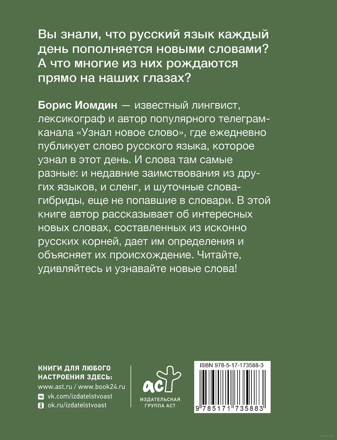 Борис Иомдин – известный лингвист, лексикограф и автор популярного телеграм-канала «Узнал новое слово», где ежедневно публикует слово русского языка, которое узнал в этот день. И слова там самые разные: и недавние заимствования из других языков, и сленг, и шуточные слова-гибриды, еще не попавшие в словари. В этой книге автор рассказывает об интересных новых словах, составленных из исконно русских корней, дает им определения и объясняет их происхождение. Читайте, удивляйтесь и узнавайте новые слова!
