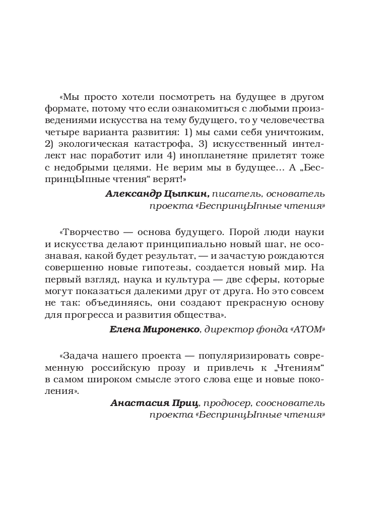 Истории Александра Бессонова, Тёны Волковой, Александра Егорова, Натальи Корсаковой, Александра Маленкова и Александра Цыпкина уже прозвучали со сцены в исполнении актеров – резидентов фестиваля "БеспринцЫпные чтения". Также свои версии будущего написали: Ольга Апреликова, Екатерина Белозерова, Роман Брюханов, Майк Гелприн, Катерина Глинистая, Наталья Дзе, Анастасия Иванова, Дмитрий Корсак, Александр Кудрявцев, Тимур Максютов, Владимир Марышев, Елена Маючая, Лидия Мельнечук, Ян Мищенко, Ирина Невская, Юрий Пронкин, Андрей Рожнов, Алена Рудницкая, Надежда Салостей, Эльдар Сафин, Сергей Скурихин, Валерий Смирнов, Алекс Тойгер, Ольга Цветкова, Ольга Юдина и Ирина Юркова.