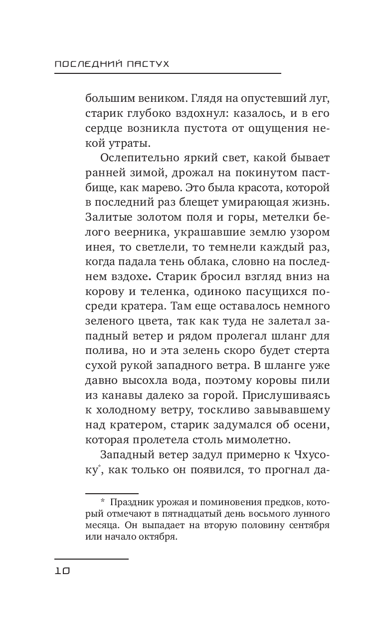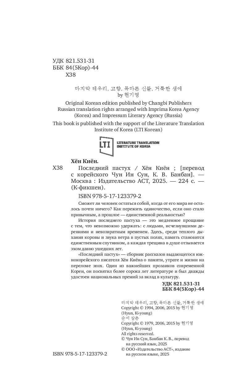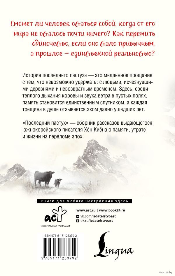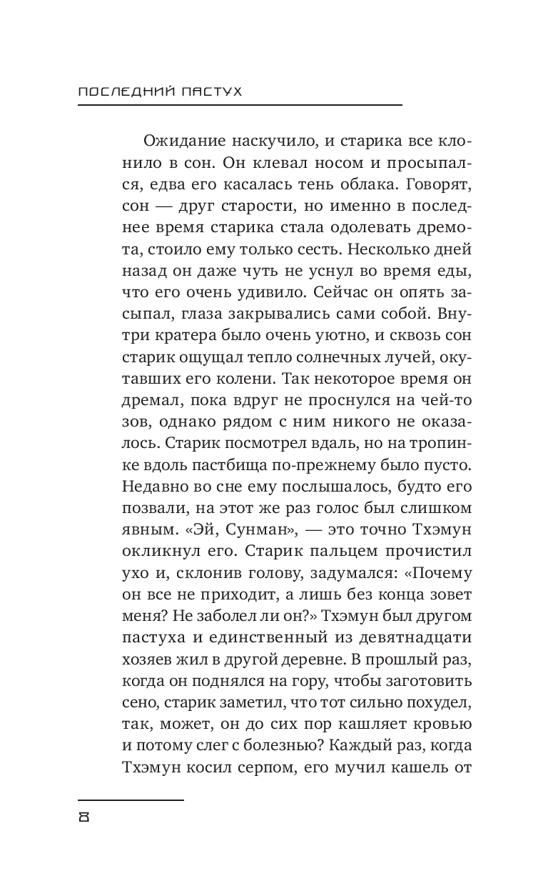 "Последний пастух" – сборник рассказов выдающегося южнокорейского писателя Хён Киёна о памяти, утрате и жизни на переломе эпох. Один из важнейших прозаиков современной Кореи, он посвятил более сорока лет литературе и был дважды удостоен национальных премий за вклад в культуру.