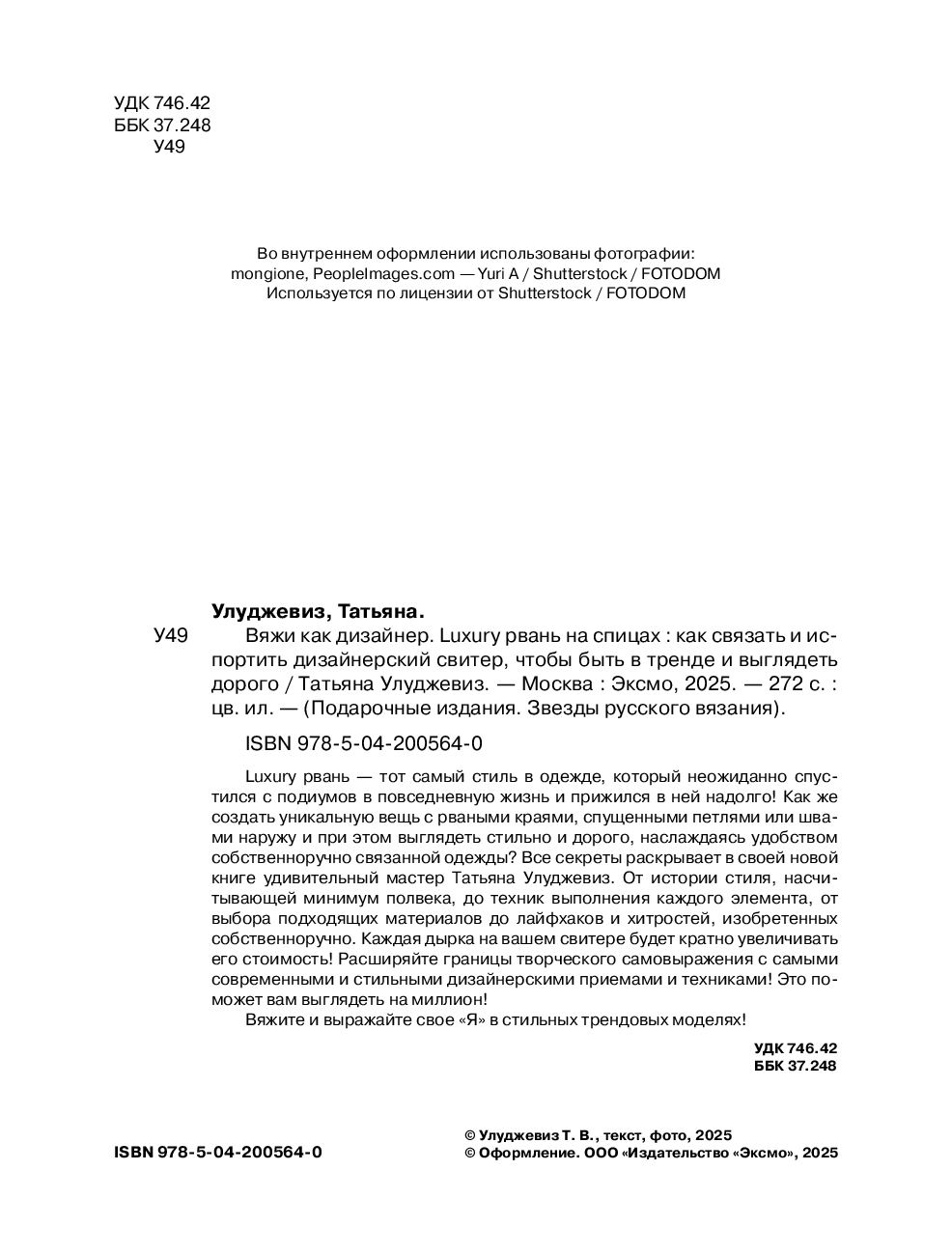 Luxury рвань – тот самый стиль в одежде, который неожиданно спустился с подиумов в повседневную жизнь и прижился в ней надолго! Как же создать уникальную вещь с рваными краями, спущенными петлями или швами наружу, и при этом выглядеть стильно и дорого, наслаждаясь удобством собственноручно связанной одежды? Все секреты раскрывает в своей новой книге удивительный мастер Татьяна Улуджевиз. От истории стиля, насчитывающей минимум полвека, до техник выполнения каждого элемента, от выбора подходящих материалов до лайфхаков и хитростей, изобретенных собственноручно. Каждая дырка на вашем свитере будет кратно увеличивать его стоимость! Расширяйте границы творческого самовыражения с самыми современными и стильными дизайнерскими приемами и техниками! Это поможет вам выглядеть на миллион!