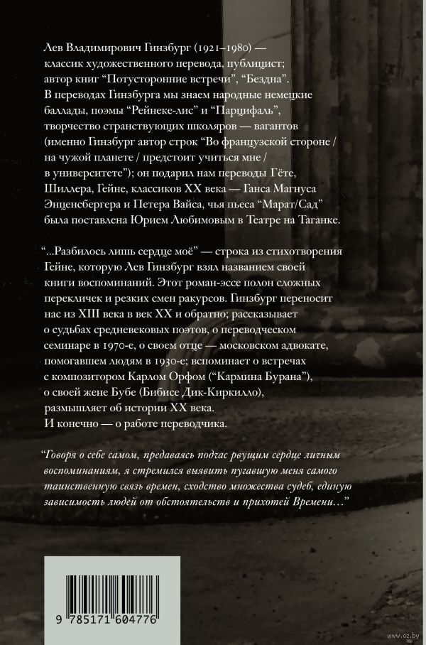 "Разбилось лишь сердце мое" – строка из стихотворения Гейне, которую Лев Гинзбург взял названием своей книги воспоминаний. Этот роман-эссе полон сложных перекличек и резких смен ракурсов.