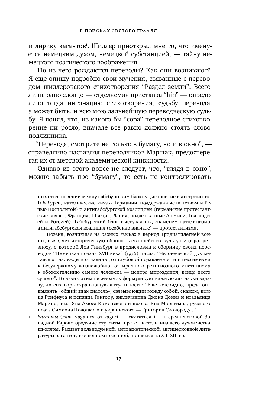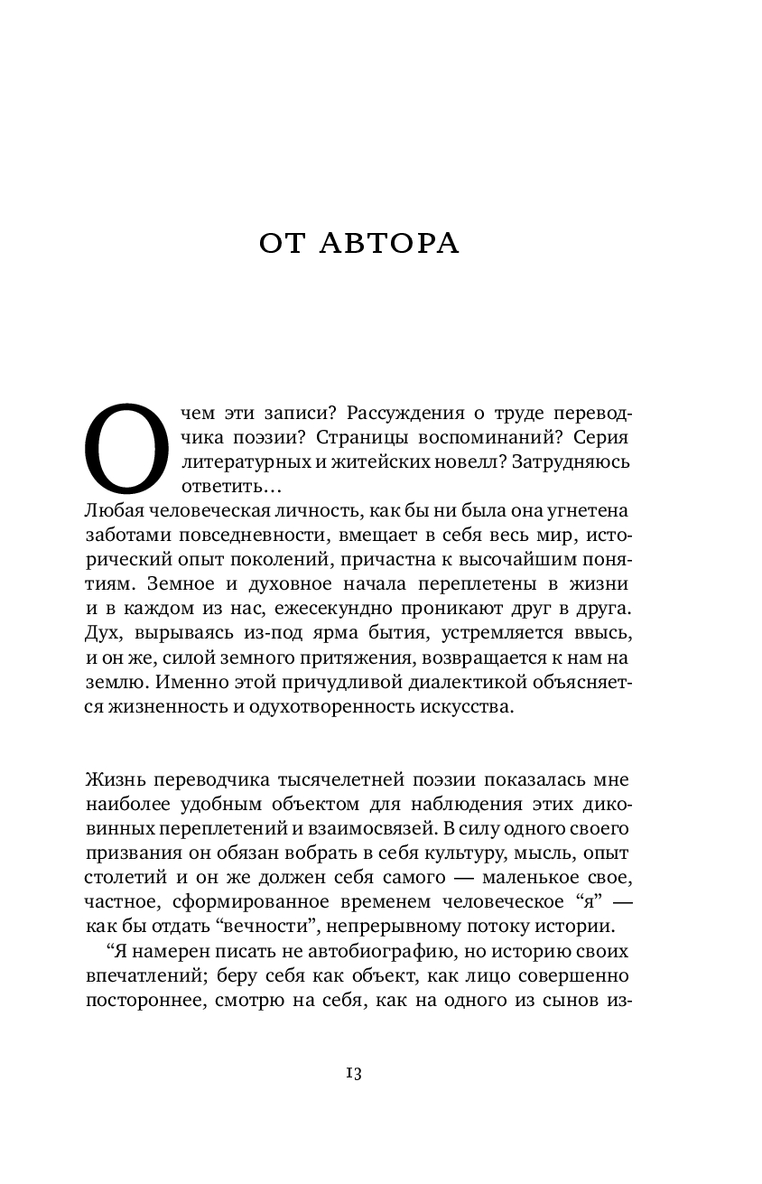 Гинзбург переносит нас из XIII века, в век XХ-й и обратно; рассказывает о судьбах средневековых поэтов, о переводческом семинаре в 1970-е, о своем отце – московском адвокате, помогавшем людям в 1930-е; вспоминает о встречах с композитором Карлом Орфом ("Кармина Бурана"), о своей жене Бубе (Бибисе Дик-Киркило), размышляет об истории ХХ века. И конечно – о работе переводчика.