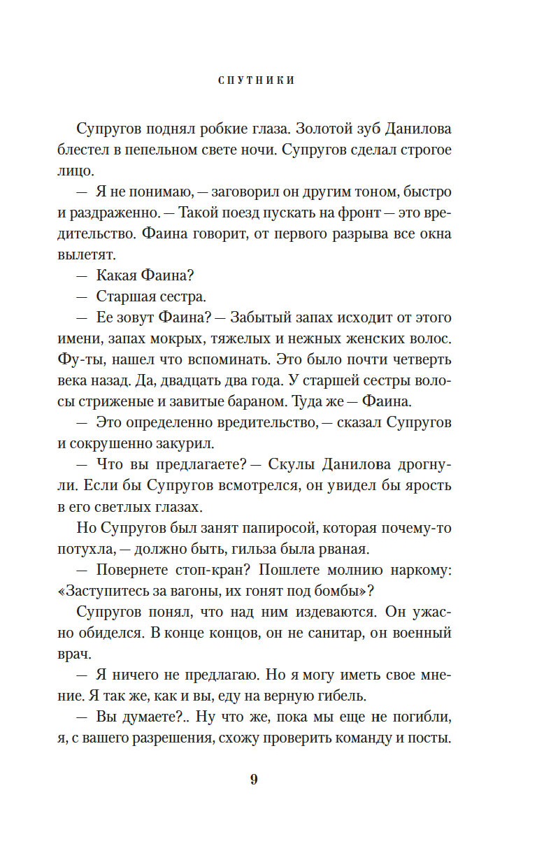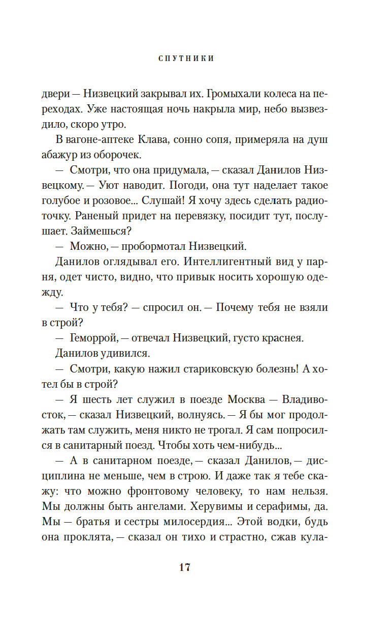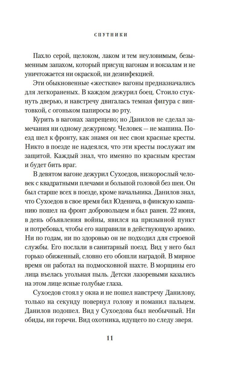 В "Спутниках" Вера Панова рассказывает о подвиге военных врачей, которые во время Великой Отечественной войны вывозили раненых с фронта в тыловые госпитали. Чтобы написать эту книгу, она два месяца участвовала в рейсах санитарного поезда к местам боев и своими глазами видела, как важен труд тех, кто спасает жизни солдат.