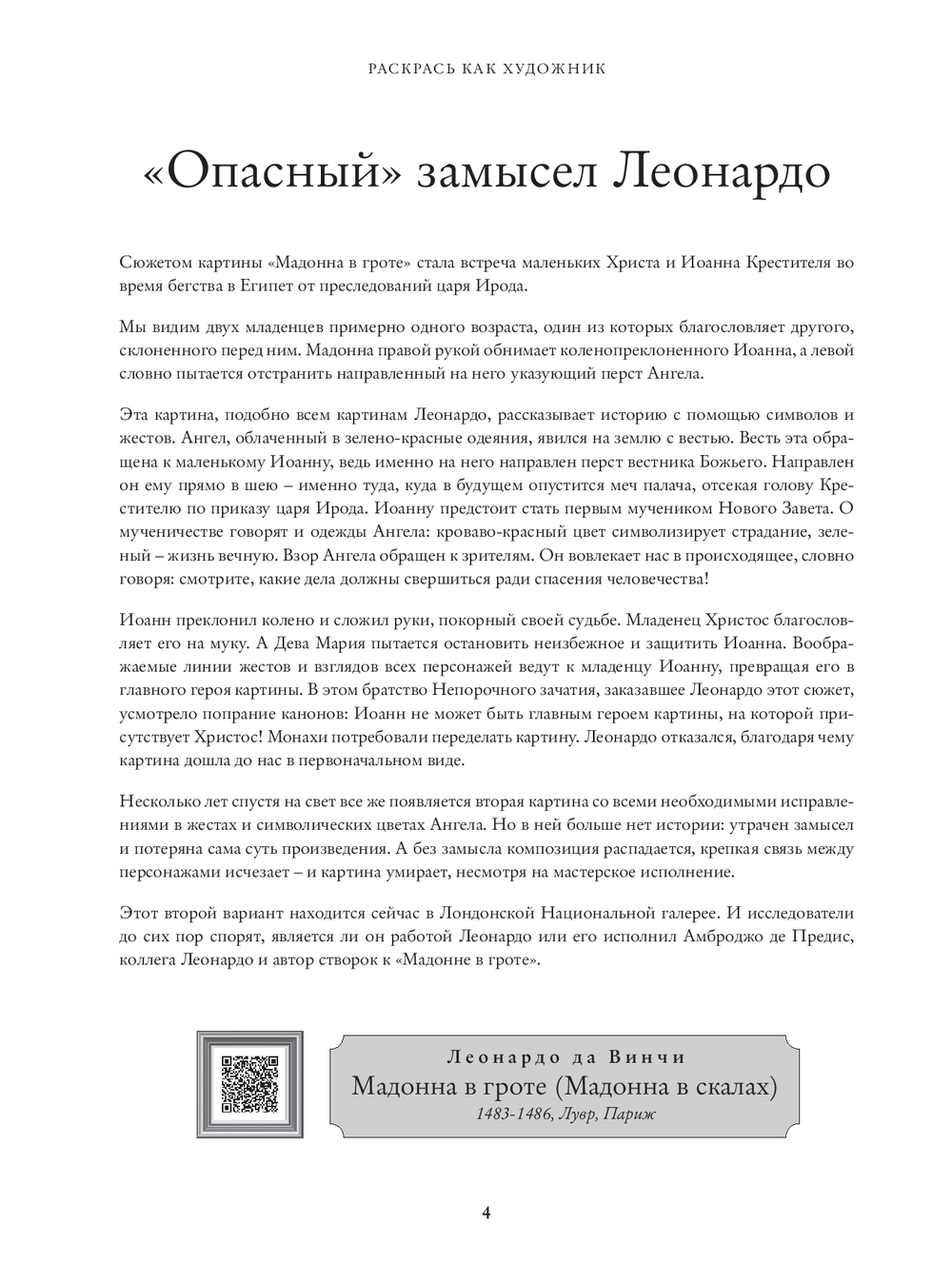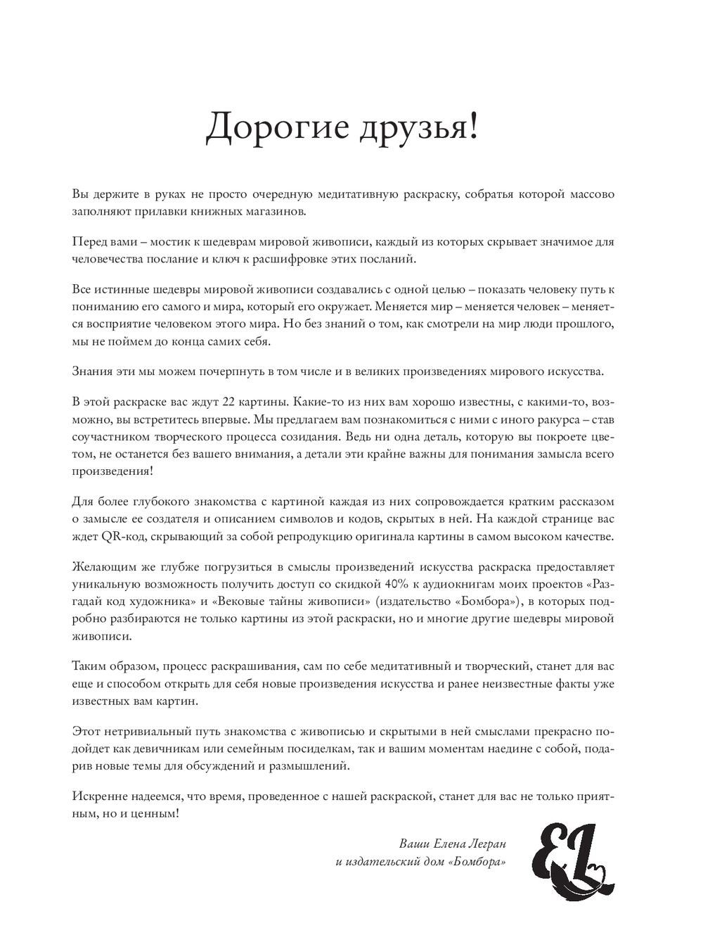 Каждая страница – это приглашение погрузиться в мир творчества и арт-терапии, где каждый мазок раскрывает тайны искусства и вдохновляет на новые открытия. Вместе с автором – искусствоведом и историком Еленой Легран – вы узнаете историю и смысл каждой картины, прочувствуете мотивы художников и взглянете на шедевры под новым углом.