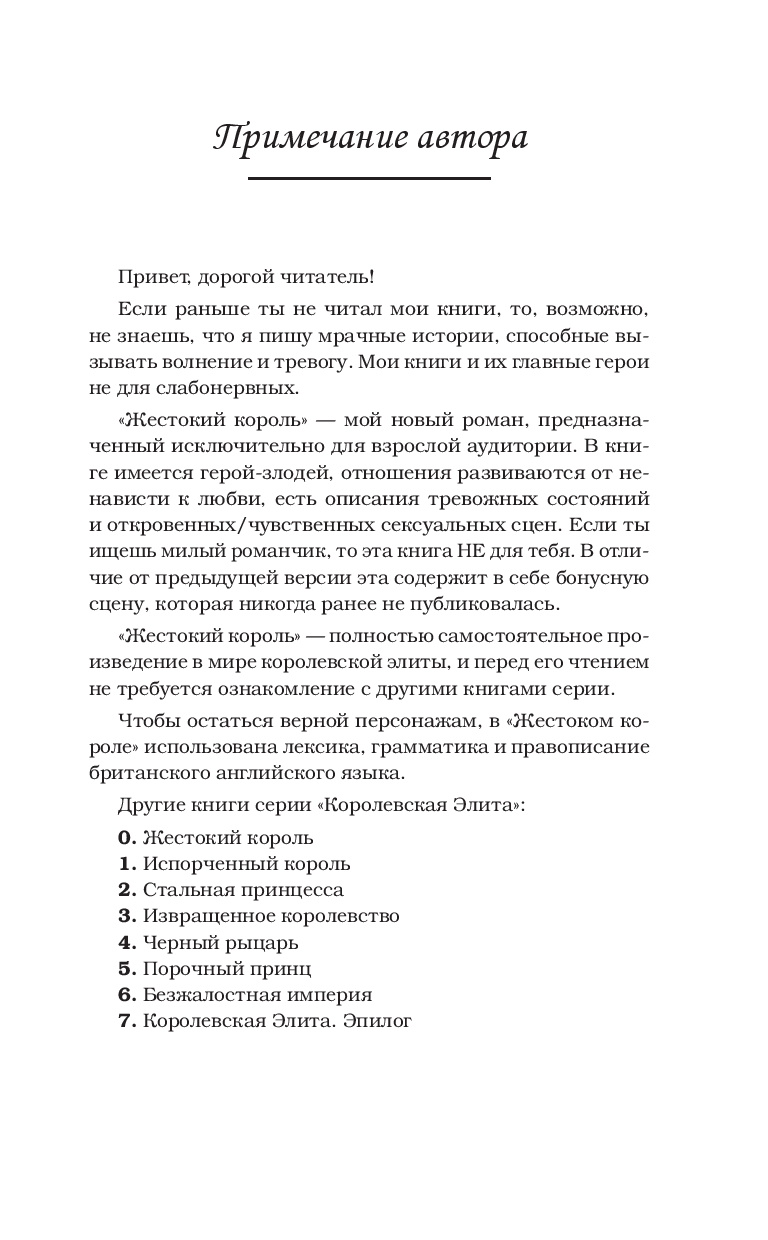 Сегодня я – мелкая сошка в Королевской Элитной Школе, а на следующий день меня преследуют и оставляют умирать. Он не только разрушает мою жизнь, но и охотится за моим сердцем.Он думает, что сломал меня, но новая принцесса поставит короля на колени