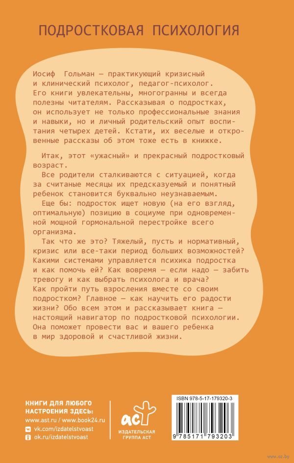 Иосиф Гольман – практикующий кризисный и клинический психолог, педагог-психолог. Его книги увлекательны, многогранны, и всегда полезны читателям. Рассказывая о подростках, он использует не только профессиональные знания и навыки, но и личный родительский опыт воспитания четырех детей. Кстати, их веселые и откровенные рассказы об этом тоже есть в книжке.