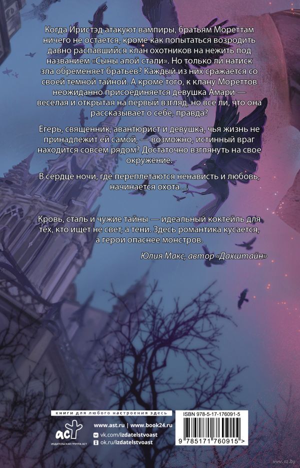 Когда Иристэд атакуют вампиры, братьям Мореттам ничего не остается, кроме как попытаться возродить давно распавшийся клан охотников на нежить под названием "Сыны алой стали". Но только ли натиск зла обременяет братьев? Каждый из них сражается со своей темной тайной. А кроме того, к клану Мореттов неожиданно присоединяется девушка Амари – веселая и открытая на первый взгляд, но все ли, что она рассказывает о себе, правда?