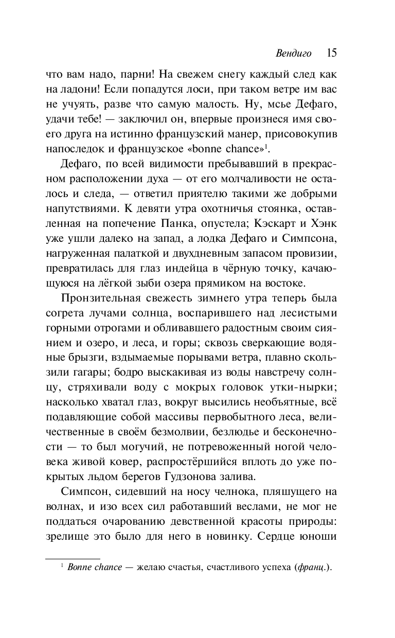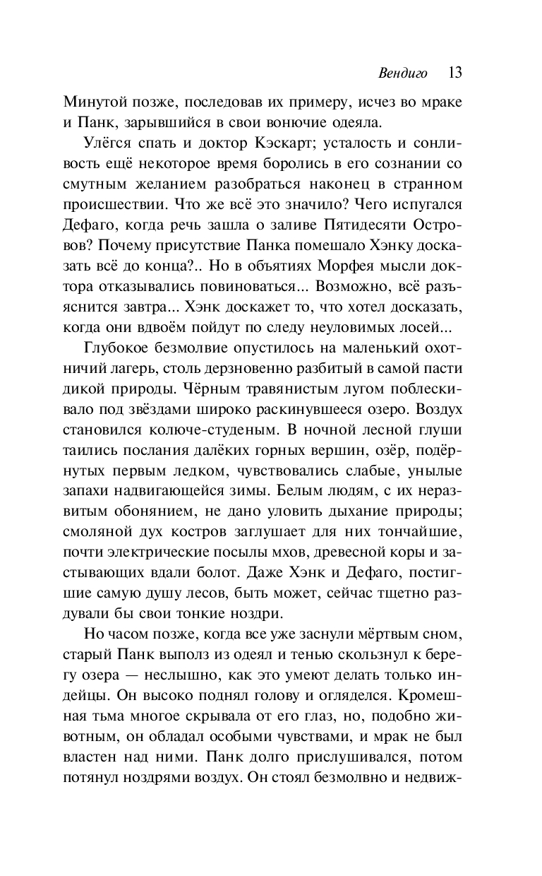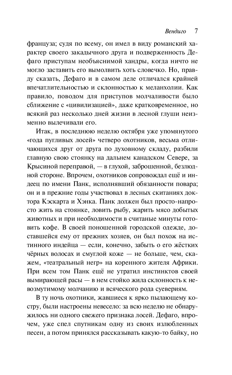 Центральная повесть сборника "Вендиго", одна из самых известных повестей Блэквуда, основана на легенде североамериканских индейцев о жутком лесном духе-людоеде, обитающем в бескрайних канадских лесах и символизирующем первобытный страх и безумие. История переносит читателя в дикие просторы Онтарио, где группа охотников сталкивается с необъяснимым и мрачным сверхъестественным началом, пробуждающим в них самые глубокие страхи и сомнения.