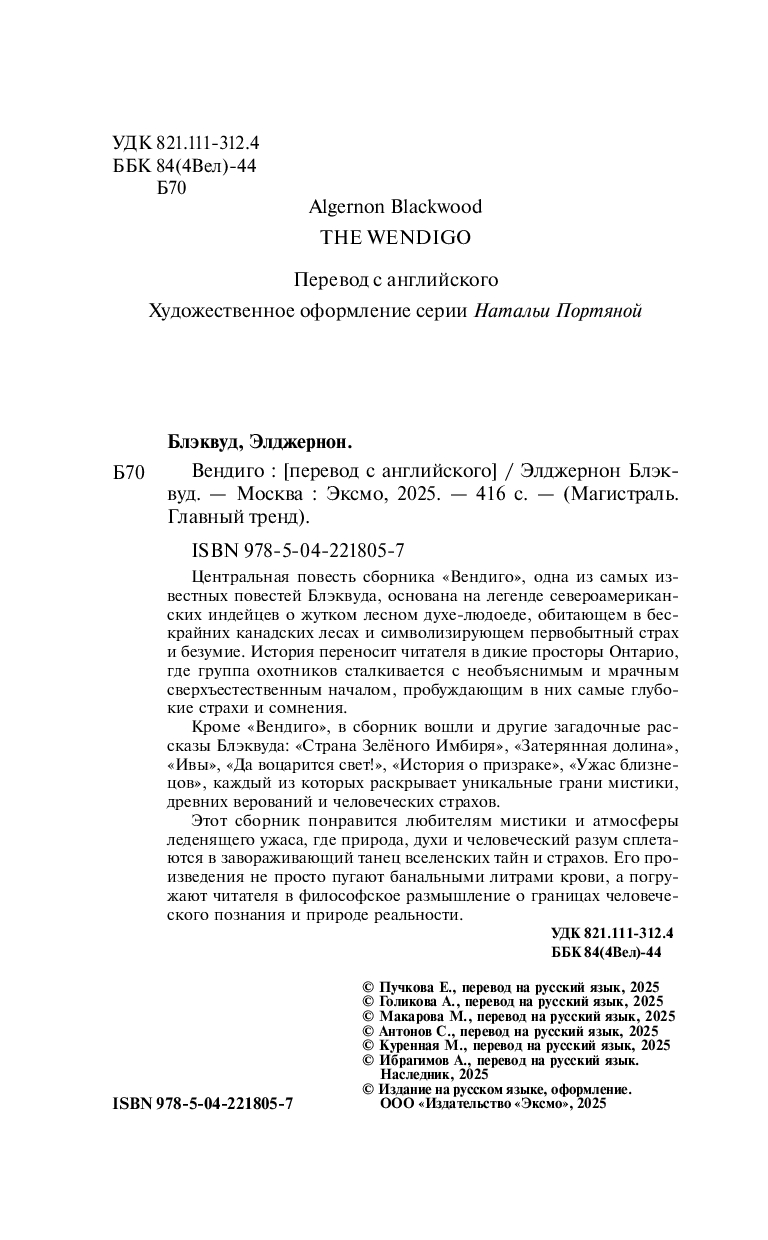 Кроме "Вендиго", в сборник вошли и другие загадочные рассказы Блэквуда: "Страна Зелёного Имбиря", "Затерянная долина", "Ивы", "Да воцарится свет!", "История о призраке", "Ужас близнецов" и другие, каждый из которых раскрывает уникальные грани мистики, древних верований и человеческих страхов.