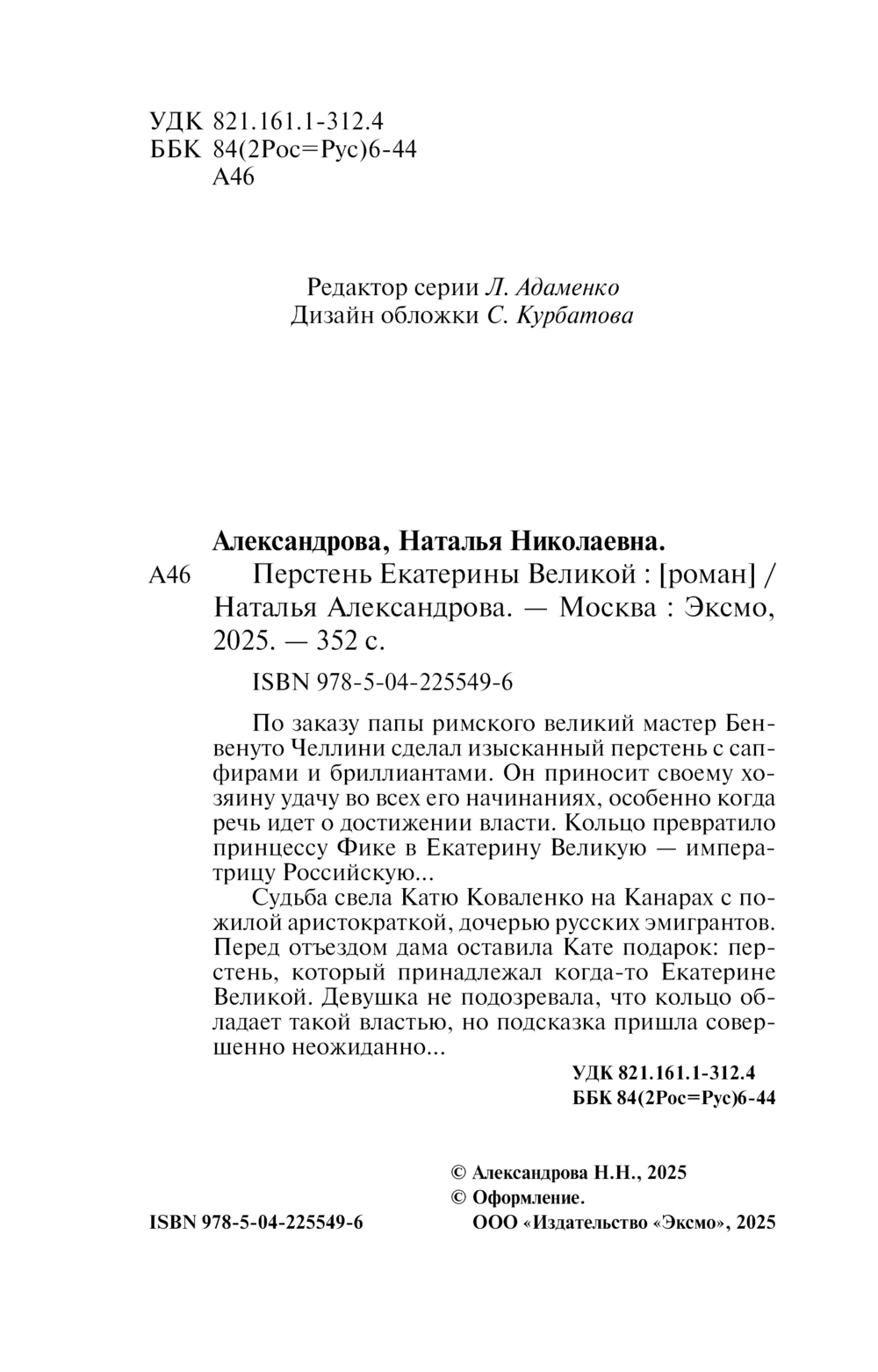 По заказу папы римского великий мастер Бенвенуто Челлини сделал изысканный перстень с сапфирами и бриллиантами. Он приносит своему хозяину удачу во всех его начинаниях, особенно когда речь идет о достижении власти. Кольцо превратило принцессу Фике в Екатерину Великую – императрицу Российскую...