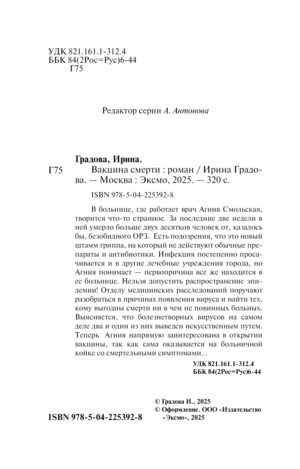 В больнице, где работает врач Агния Смольская, творится что-то странное. За последние две недели в ней умерло больше двух десятков человек от казалось бы безобидного ОРЗ. Есть подозрения, что это новый штамм гриппа, на который не действуют обычные препараты и антибиотики. Инфекция постепенно просачивается и в другие лечебные учреждения города, но Агния понимает – первопричина все же находится в ее больнице. Нельзя допустить распространение эпидемии! Отделу медицинских расследований поручают разобраться в причинах появления вируса и найти тех, кому выгодны смерти ни в чем неповинных больных. Выясняется, болезнетворных вирусов на самом деле два, и один из них – выведен искусственным путем. Теперь Агния напрямую заинтересована в открытии вакцины, так как сама оказывается на больничной койке со смертельными симптомами...
