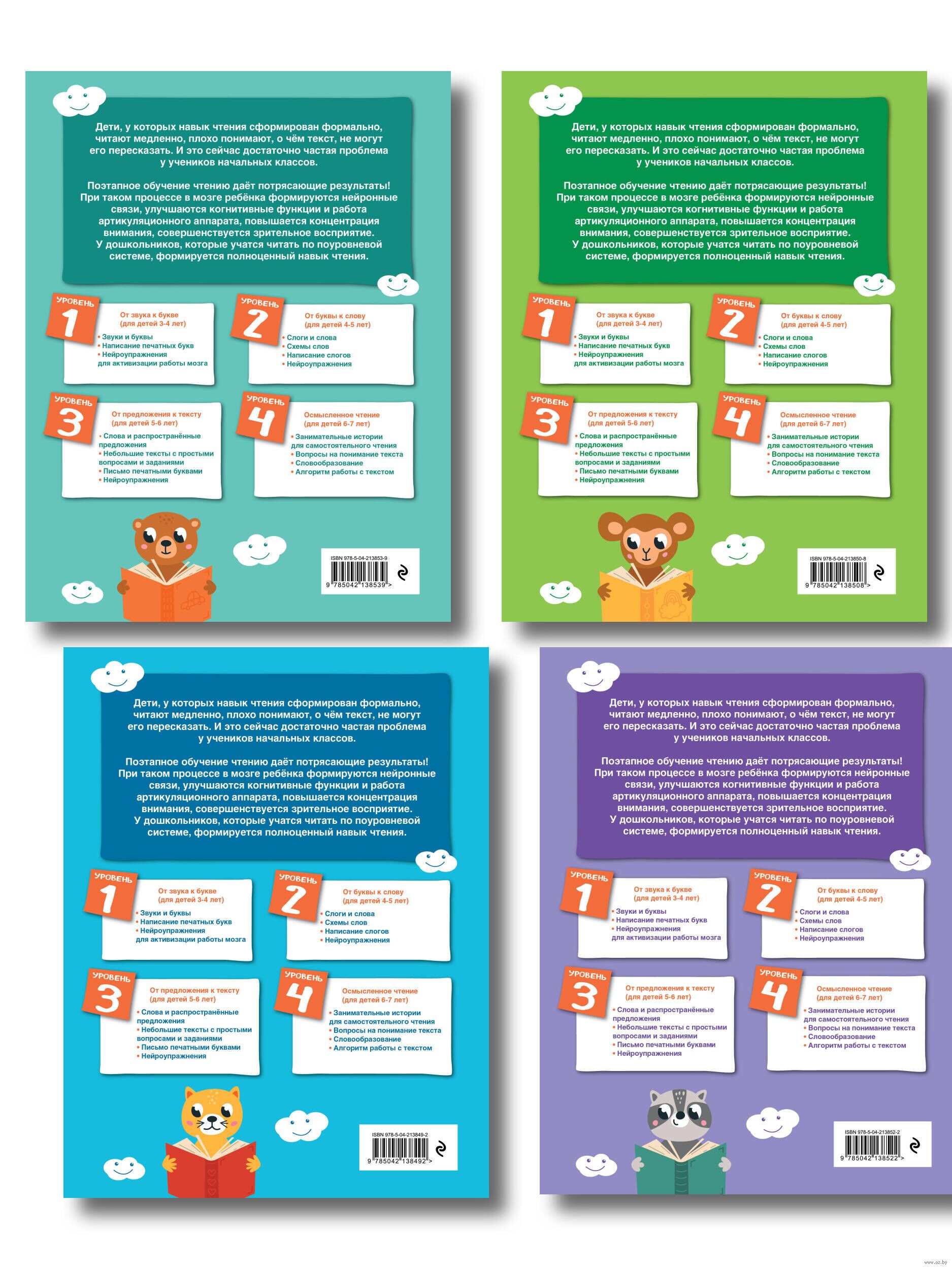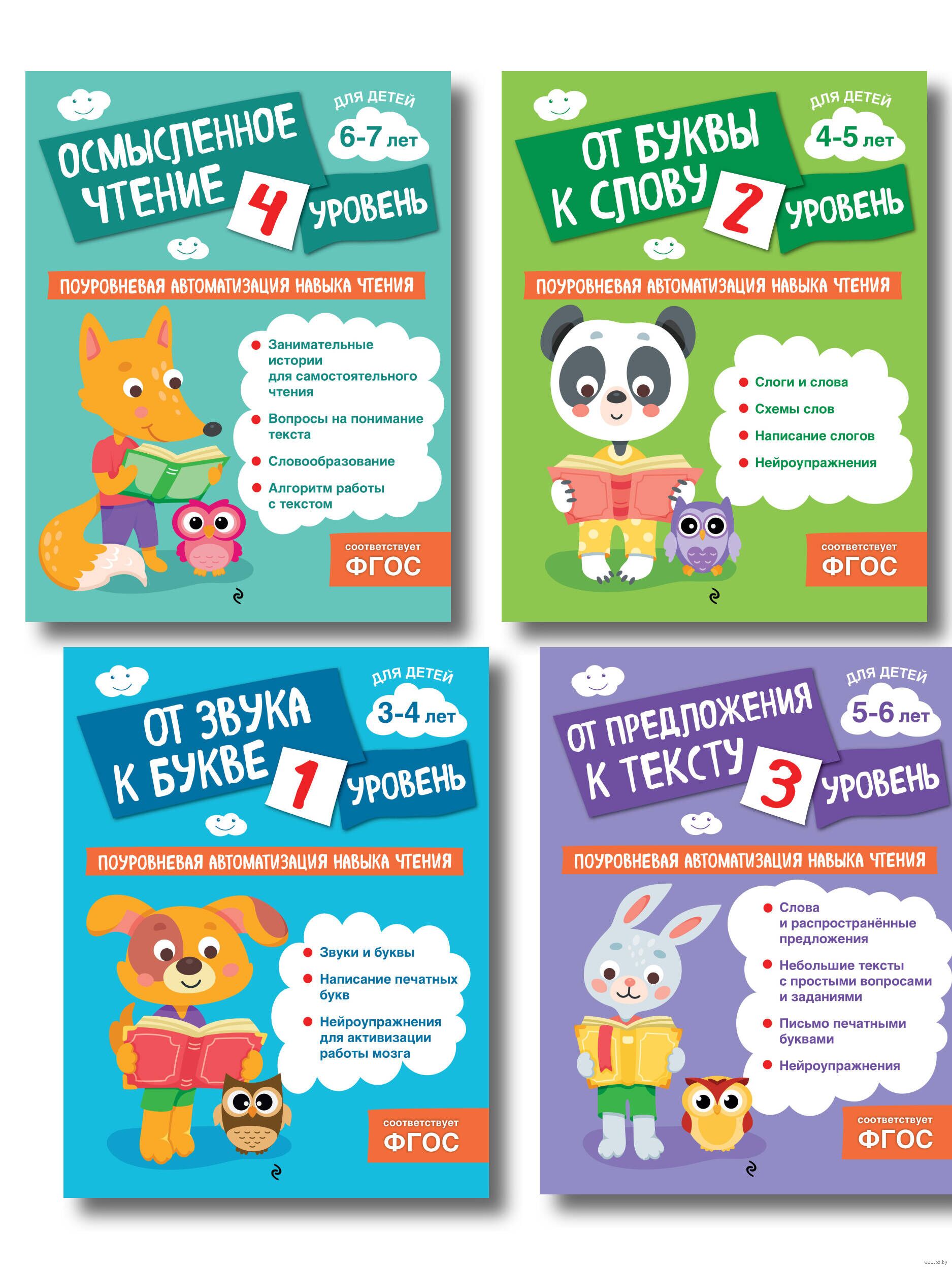 В комплект "Тренажеры по чтению. Уровни 1, 2, 3, 4" входят книги: "От звука к букве. Уровень 1", "От буквы к слову. Уровень 2", "От предложения к тексту. Уровень 3", "Осмысленное чтение. Уровень 4".
