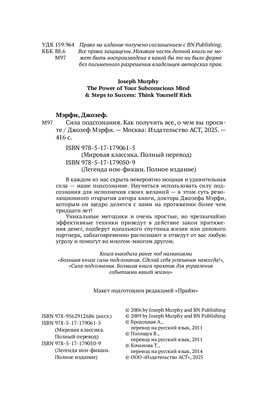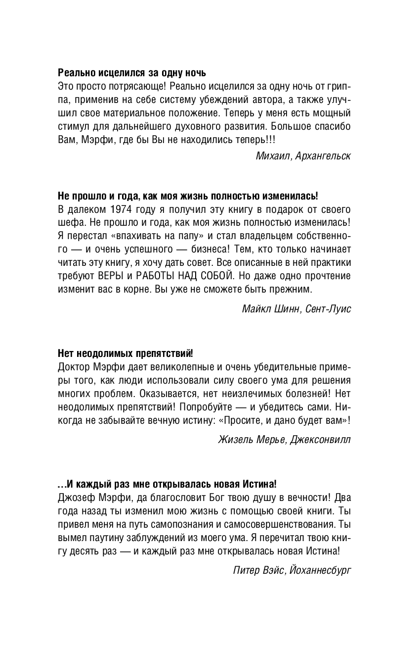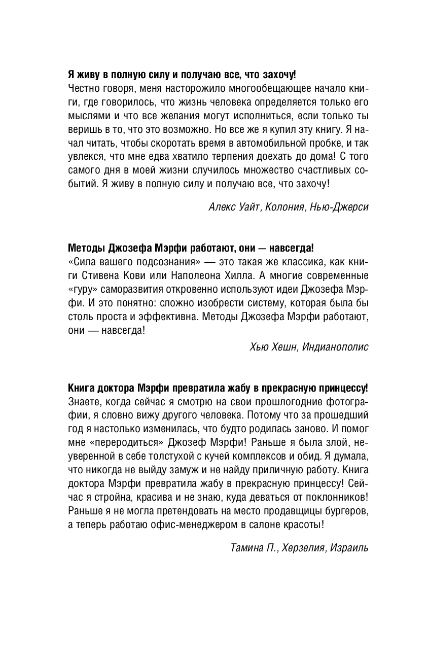 Идеи доктора Дж. Мэрфи, сформулированные еще в середине XX века, остаются актуальными до сих пор и помогают людям раскрыть невероятную силу подсознания. В этой книге – простые, но совершенно удивительные техники, которые могут творить чудеса!