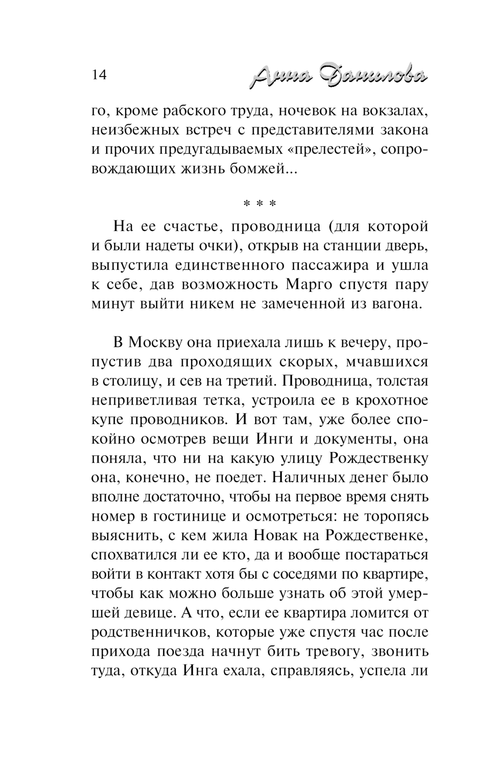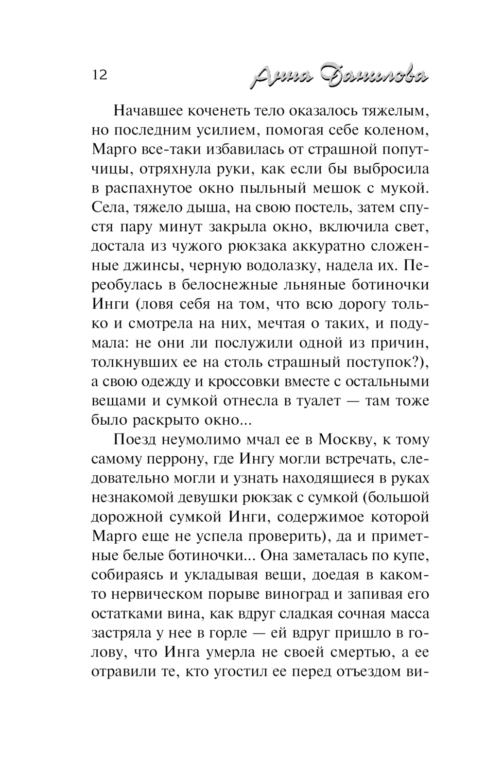 Судьба насмехалась над Марго, когда столкнула ее, бездомную и без гроша в кармане, в одном купе с внезапно умершей девушкой, обладательницей не только московской прописки, но и портмоне, набитого деньгами. Казалось, что кто-то могущественный предлагает Марго занять ее место. Но как это сделать по-умному? Первое, что пришло в голову, это избавиться от тела. Лучше бы Марго этого не делала! Выкинув труп в окно, Марго отрезала себе все пути к отступлению: вместе с вещами и документами покойной, она приняла на себя и чужую жизнь...