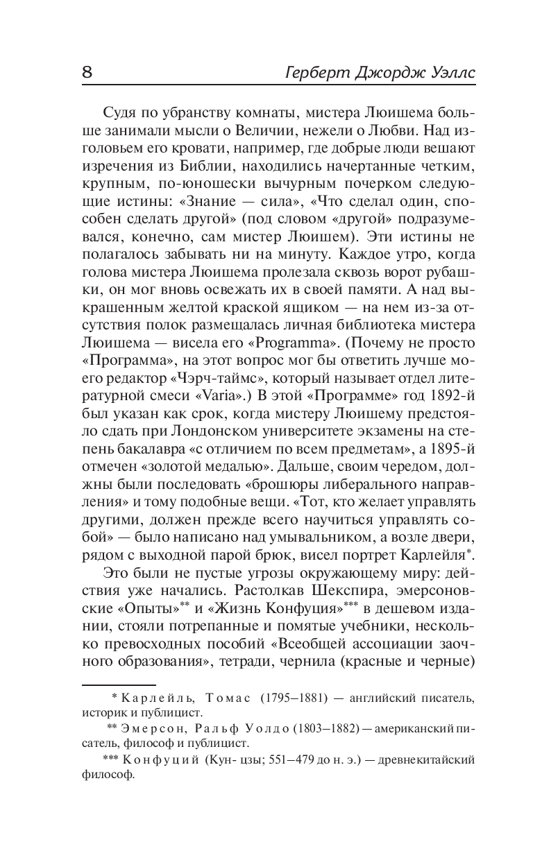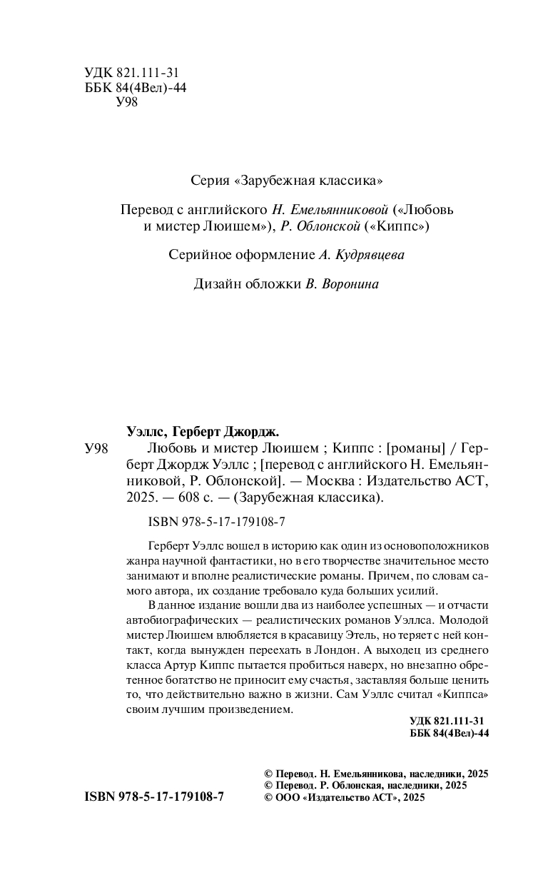 В данное издание вошли два из наиболее успешных – и отчасти автобиографических – реалистических романов Уэллса. Молодой мистер Люишем влюбляется в красавицу Этель, но теряет с ней контакт, когда вынужден переехать в Лондон. А выходец из среднего класса Артур Киппс пытается пробиться наверх, но внезапно обретенное богатство не приносит ему счастья, заставляя больше ценить то, что действительно важно в жизни. Сам Уэллс считал "Киппса" своим лучшим произведением.