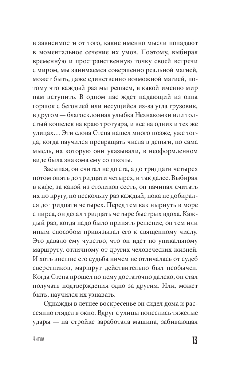 Если числа и цифры правят нашей жизнью, совсем не обязательно она становится математически точной и понятной. Герой "Чисел" – бизнесмен ельцинской эпохи Степан – всю жизнь боялся числа 43 и доверял числу 34. Одно вело к горестям и потерям, второе – к удачам и успеху. И даже фильм про трех танкистов и собаку он полюбил именно за то, что танкистов было три, а собака была четвертой! Но истинная свобода – в иррациональном, где нет ни тройки, ни четверки, а есть только маленькая походная сумка, загранпаспорт с открытой визой, сердце в груди и пачка долларов в кармане…